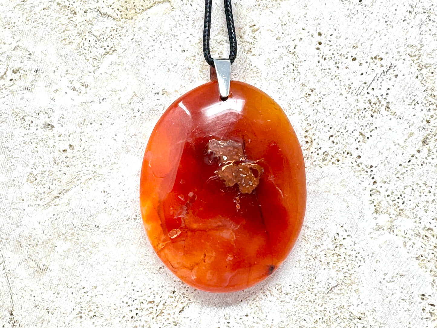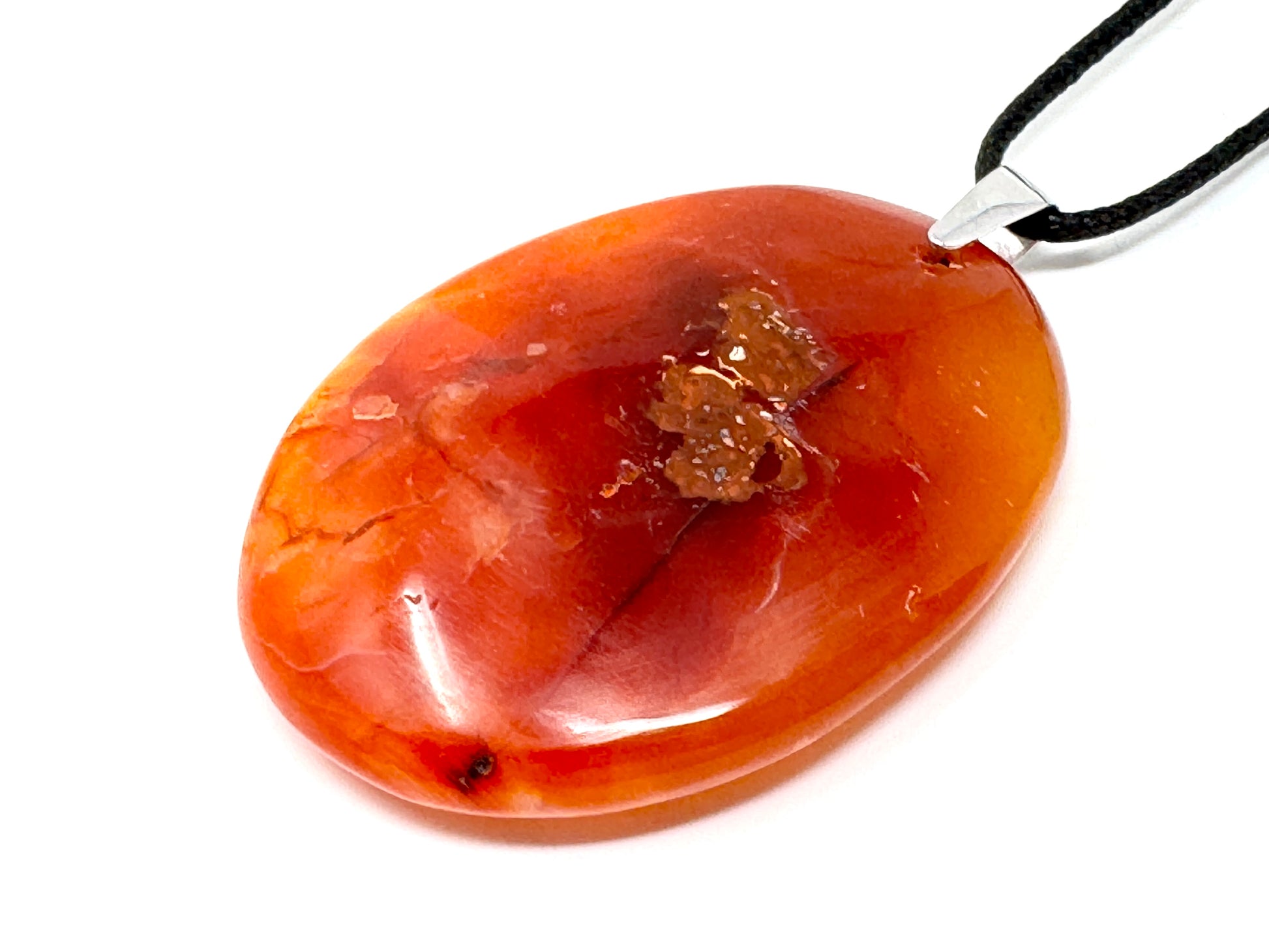 This unique piece of Hand-Made Crystal Jewellery has been cut from Carnelian Stone into a Large Oval Pendant Shape and hand-polished to a fantastically high standard in our UK workshop to create a smooth Large Polished Carnelian Crystal Pendant.