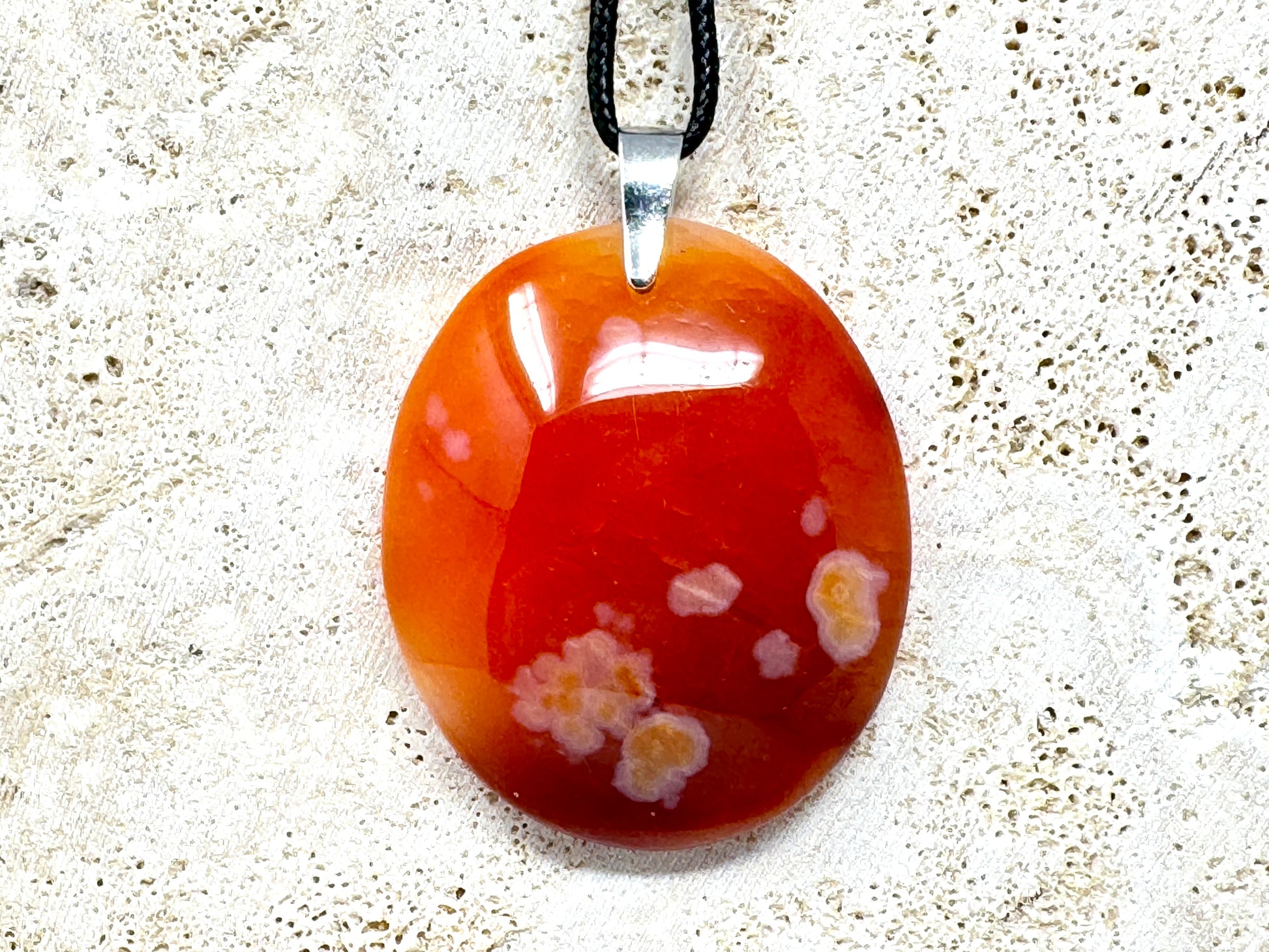 This unique piece of Hand-Made Crystal Jewellery has been cut from Carnelian Stone into a Large Oval Pendant Shape and hand-polished to a fantastically high standard in our UK workshop to create a smooth Large Polished Carnelian Crystal Pendant.