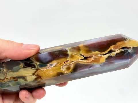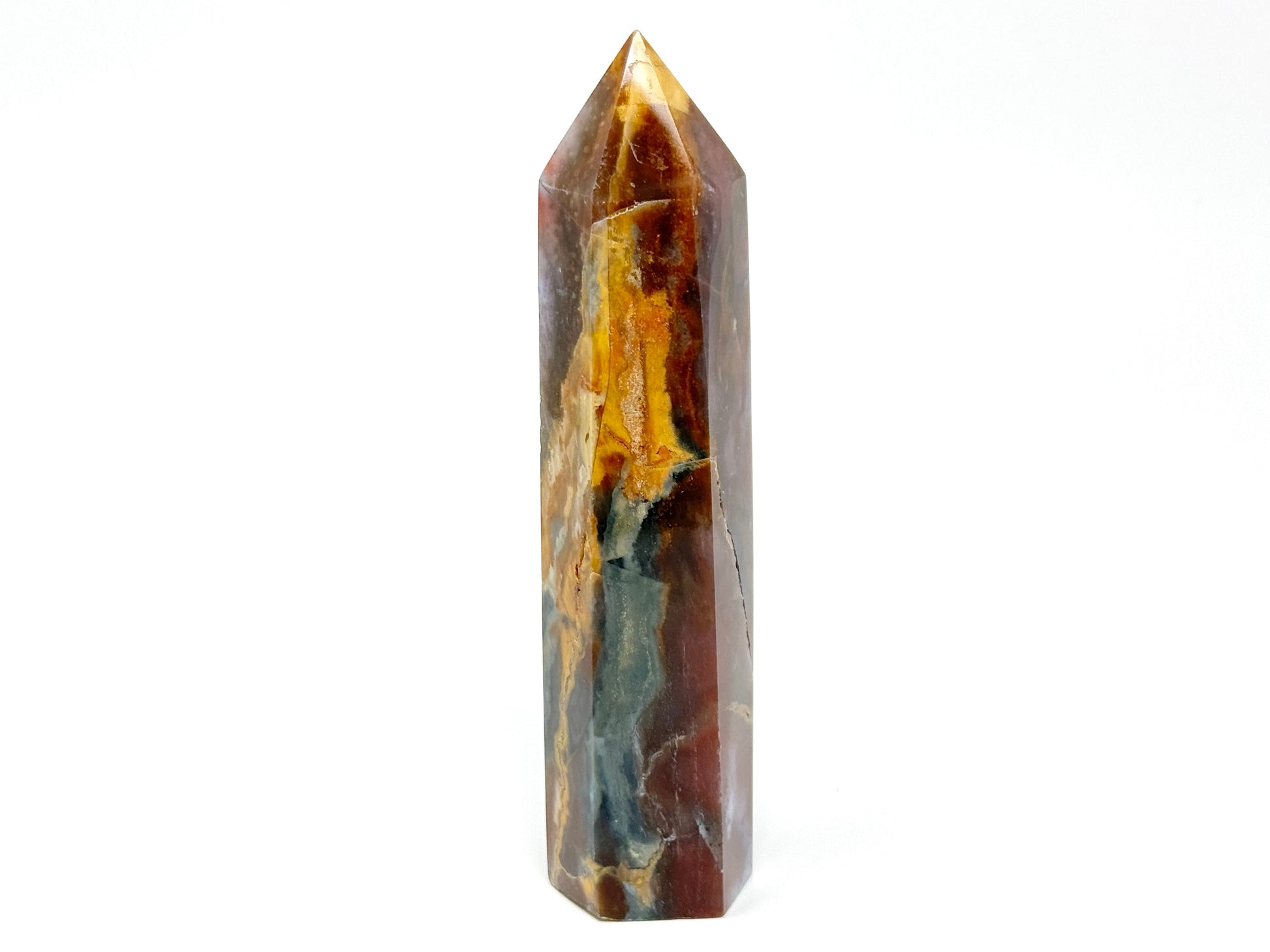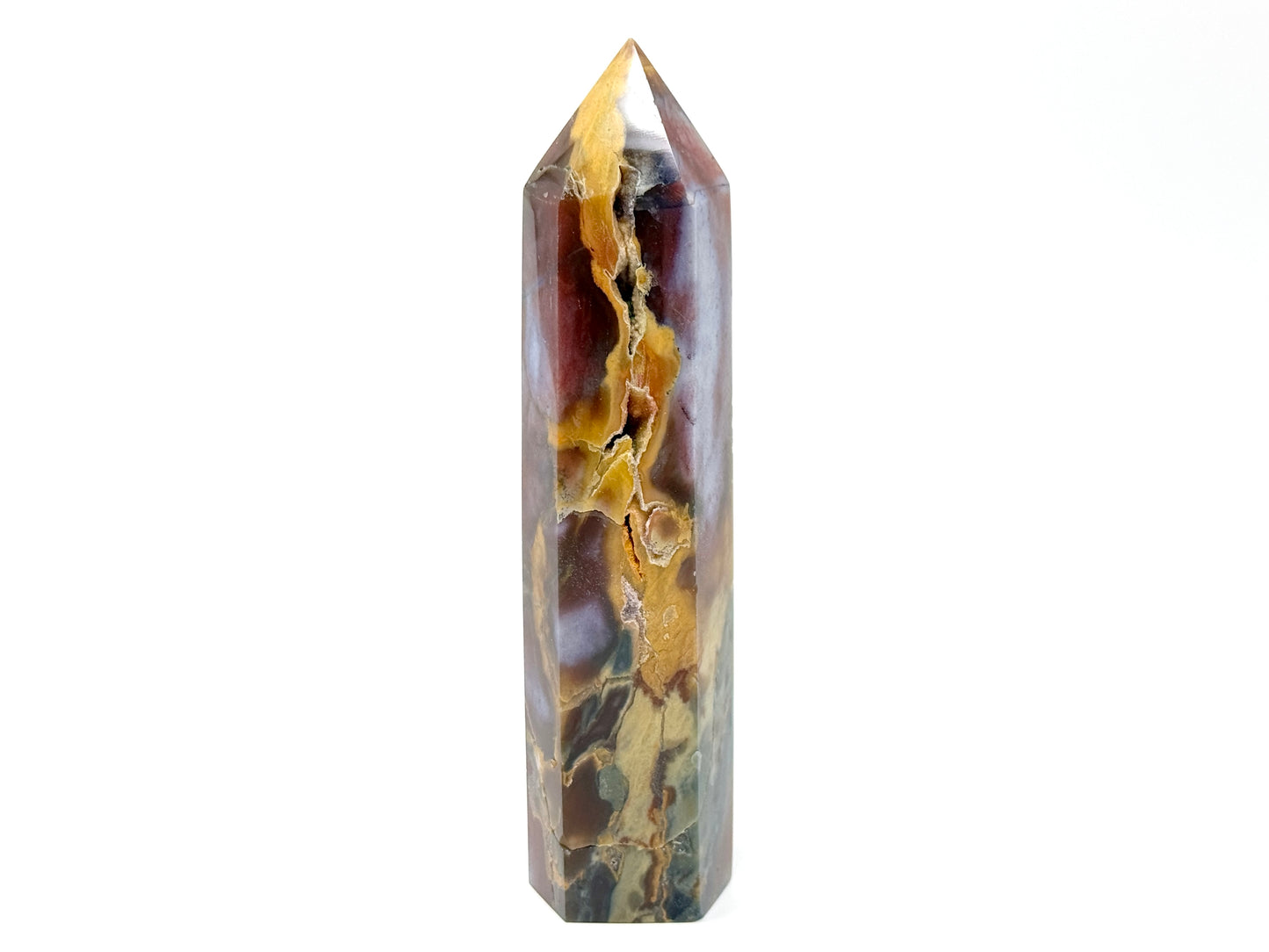 Mookaite Jasper is one of the most striking stones we have to offer at Madagascan Direct, and this piece has been cut by artisans into an equally striking free-standing crystal point shape.