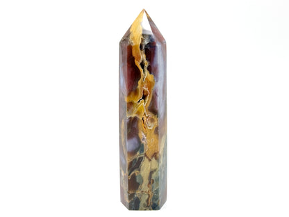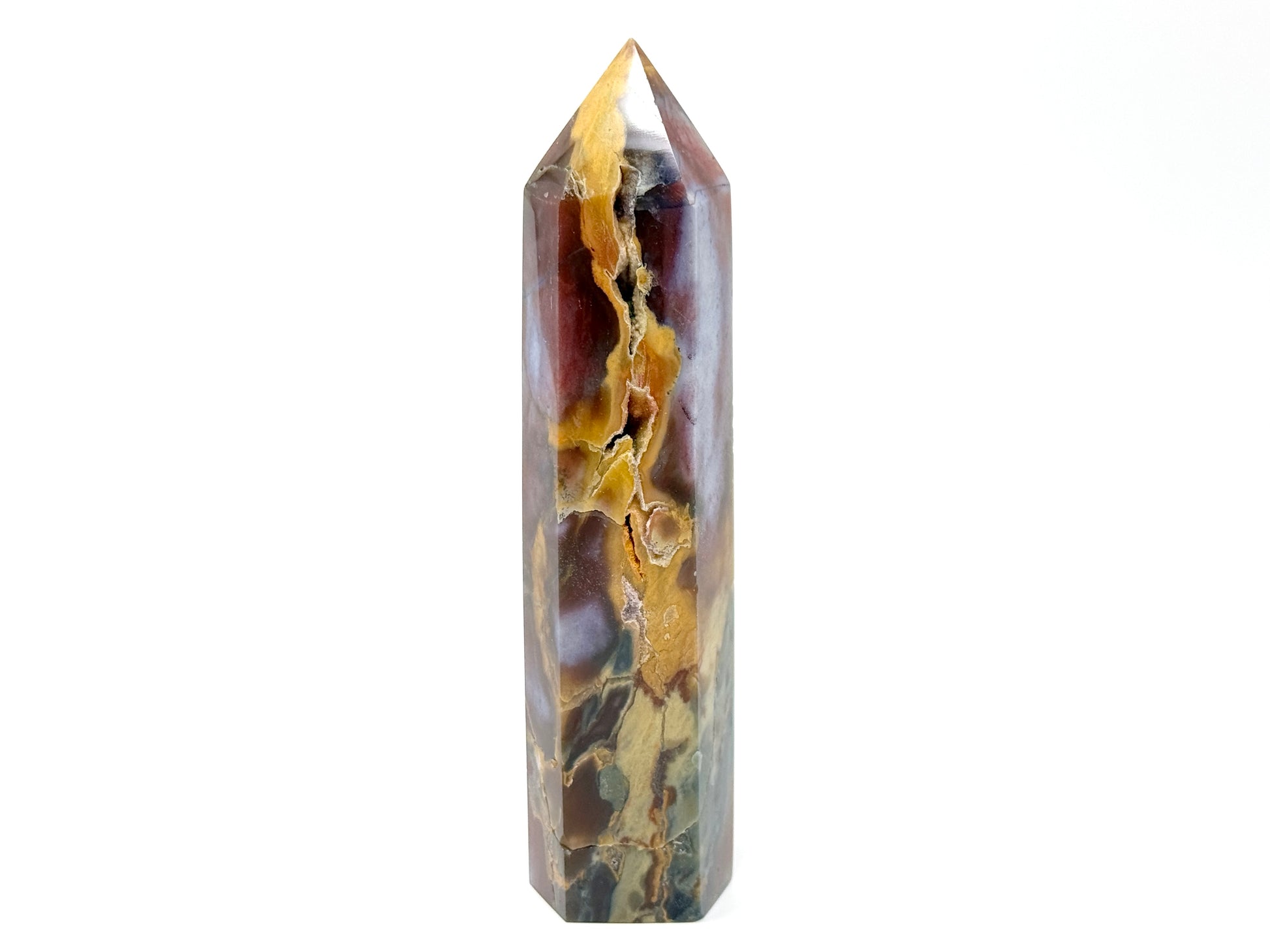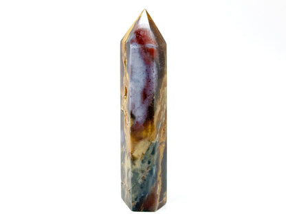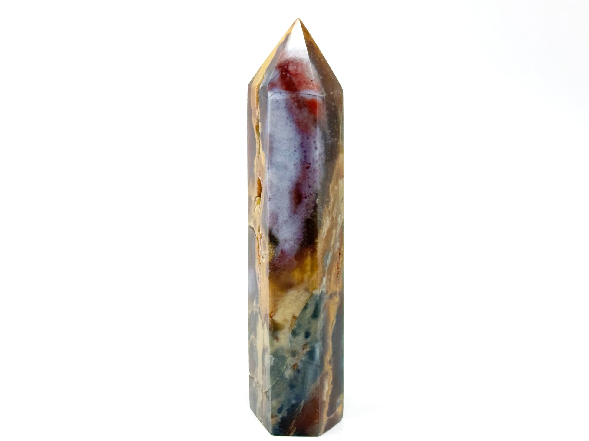This stunning free-standing Large Druzy Mookaite Jasper Crystal Point measuring 16.5cm tall has been carefully hand-polished to enhance its vibrant kaleidoscope of colour, which includes vibrant reds, mustard-yellows, maroons, and cream and beige tones.