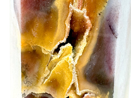 This Large Mookaite Crystal Point displays large natural crystal cavities filled with sparkling druzy crystals.