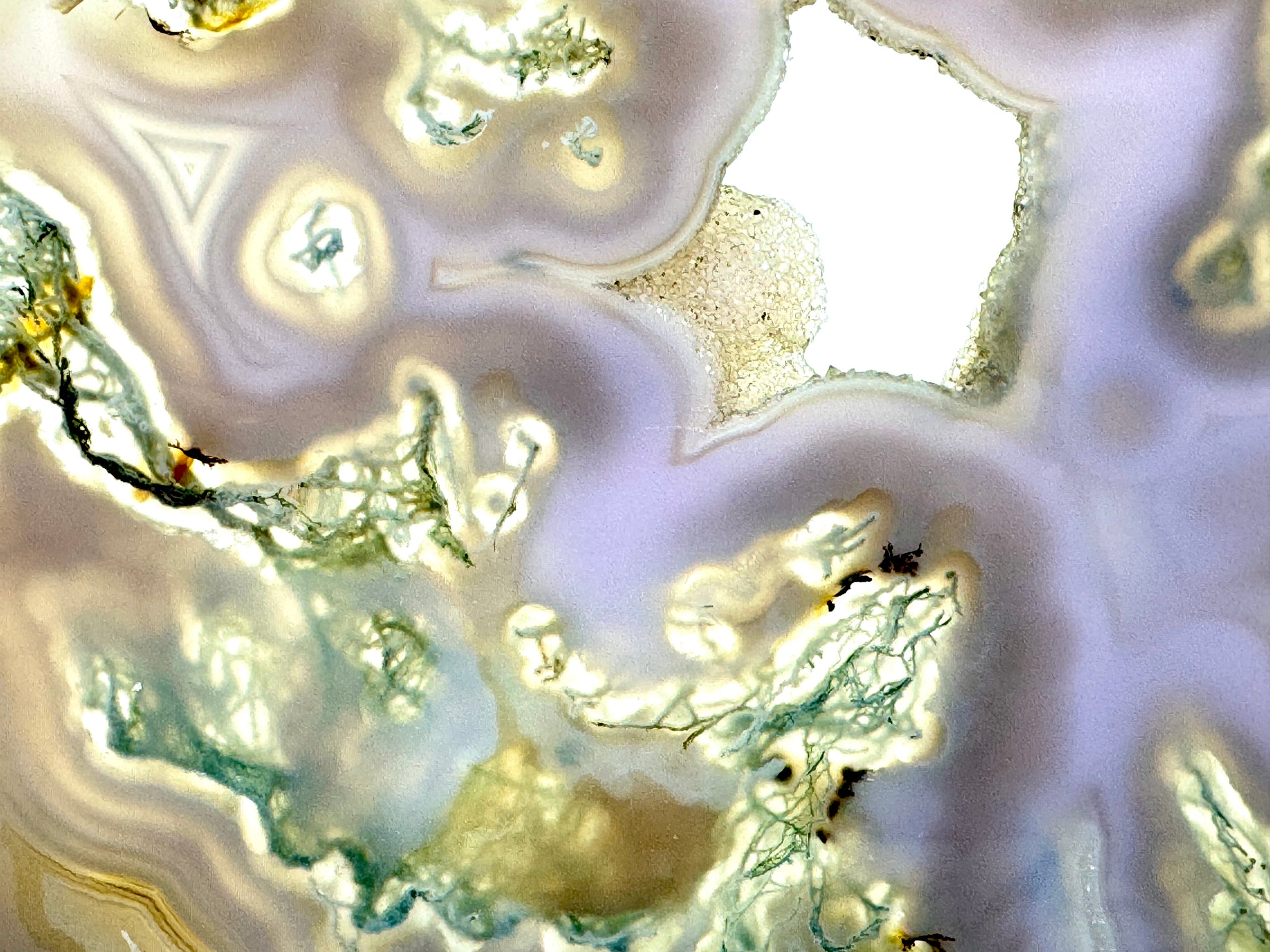 Purple Moss Agate Crystals display the same green moss-like dendritic patterns so revered in typical Moss Agate (Tree Agate) but instead of tree-like white and green colouring, this Druzy Purple Moss Agate Slice stuns with translucent Purple Chalcedony, which ranges in hue from lilacs and lavenders to hints of deep indigo.