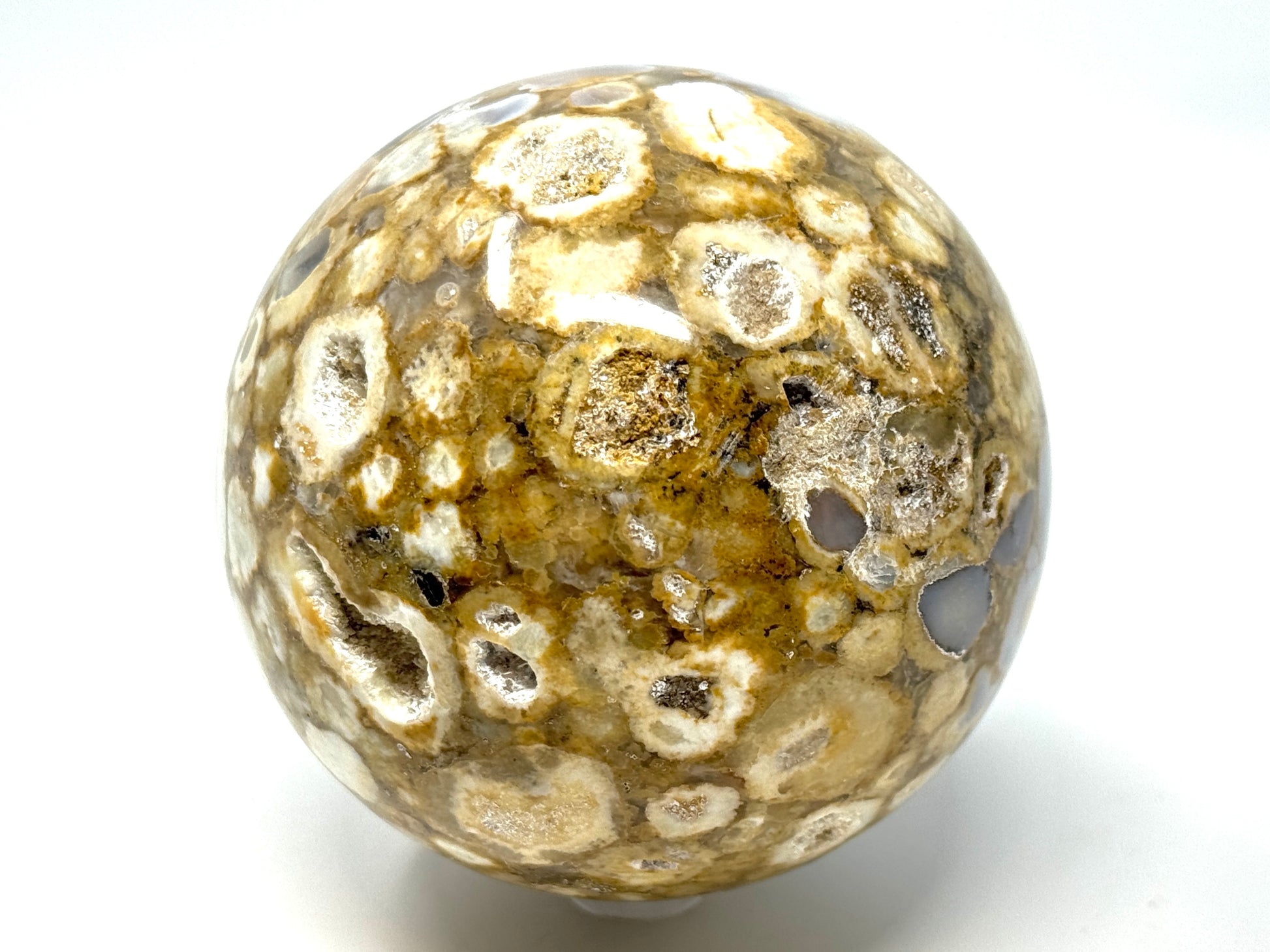 King Cobra Jasper Sphere, crystal for sale from India. This wonderful and different King Cobra Jasper sphere is 8.4 cm diameter and displays a unique orb pattern with rich colours.This amazing rare Jasper stone is named King Cobra on account of its likeness with one of the deadliest snakes in the world. The look is sure to keep you mesmerised with the orbs on the surface of the crystal. The unique shades of colour of the crystal stand out from all other kinds of Jaspers found across the world. The glorious orbs are created by spherical inclusions of radial aggregates that happen to be needle like accumulation of crystals within the stone. Ranging from the palest of white to a rich maroon hue, there are Reds, yellows, oranges and browns in wonderful spaced patterns accounting for its eye catching appearance. The psychics and crystal healers of the world are reluctant to let go of this amazing Jasper that has also been christened as a counsellor’s stone. It is believed to have amazing metaphysical properties that can control the anger and tame the primal energy inducing balancing and calming to the user. It is also known to sharpen the senses and heal a number of ailments thus banishing the negativity completely from the body. Sure, it sounds fantastic but you would have to be a believer to unleash its energy. We have retained a small team of artisans who are working hard to keep up with the demand by cutting and polishing the stones so as to achieve the spectacular highly polished forms. Choose a piece of this amazing King of Jasper's that has been likened to the King of all reptiles a.k.a The King Cobra. A truly stunning addition for any collection. Or as a unique display piece in any home.