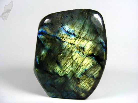Labradorite Freeform shape, 12cm tall, showing a beautiful mix of lovely green and blue colours flashing from deep within the stone. Excellent Labradorescence is shown also known as the schiller effect which is the stones famous property. When exposed to the light the gem becomes a shimmering tapestry of colour. Hand selected by ourselves in Madagascar this freeform is of the highest grade and its beauty will enchant you.The natives of Pauls island off the coast of Labrador have told the story of Labradorite for generations. The tale recounts a legendary Inuit warrior the first to discover that the Aurora Borealis had been stolen from the skyand imprisoned in the gem known as Labradorite, smashing the stone with his spear he returned the northern lights to their home, but some light remained eternally encased in the crystal. As legend has it this is how the phenomenon of Labradoresence came to be.