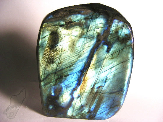 Labradorite Freeform shape, 12cm tall. Beautifully impressive showing a stunning mix of vibrant gold and metallic blue colours flashing from deep within the stone. Excellent Labradorescence is shown also known as the schiller effect which is the stones famous property. When exposed to the light the gem becomes a shimmering tapestry of colour. Hand selected by ourselves in Madagascar this freeform is of the highest grade and its beauty will enchant you.The natives of Pauls island off the coast of Labrador have told the story of Labradorite for generations. The tale recounts a legendary Inuit warrior the first to discover that the Aurora Borealis had been stolen from the skyand imprisoned in the gem known as Labradorite, smashing the stone with his spear he returned the northern lights to their home, but some light remained eternally encased in the crystal. As legend has it this is how the phenomenon of Labradoresence came to be.