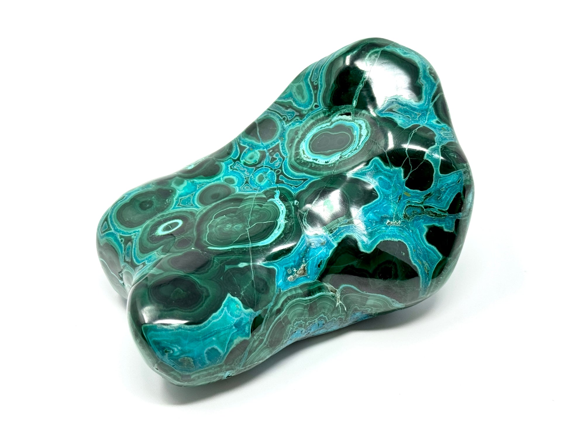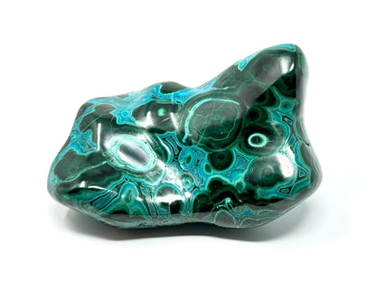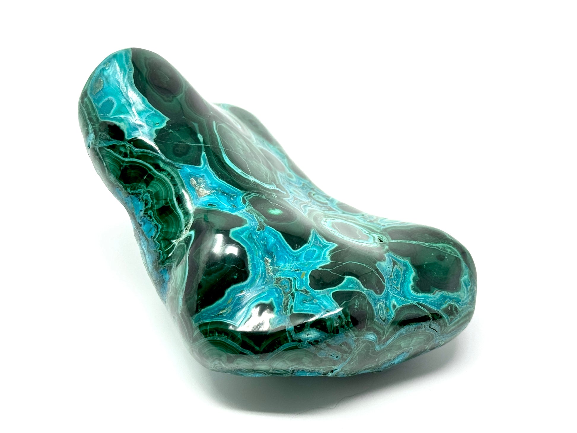 This striking, hand-polished Large Malacholla Crystal Freeform measures 10cm long and displays gorgeous turquoise and aqua-blue hues alongside deep emerald greens, given its harmonious mixture of Blue Chrysocolla and Green Malachite.