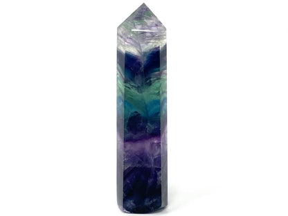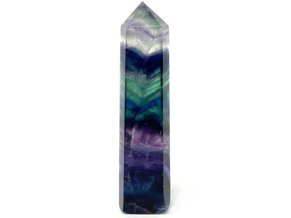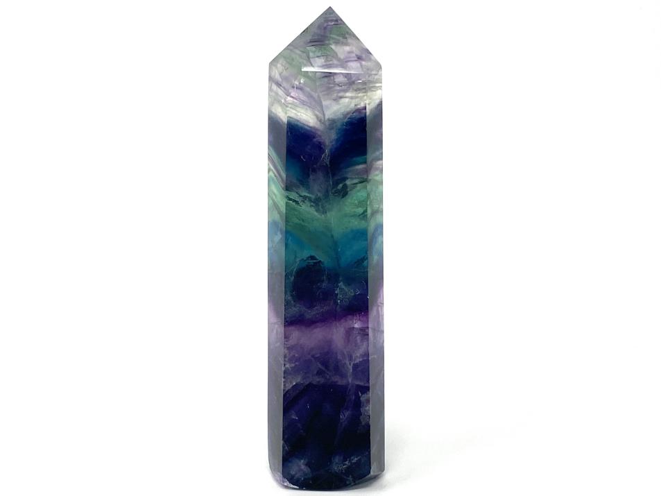 This subtle, colourful 15.5cm tall Large Rainbow Fluorite Point showcases a spectacular spectrum of colour.