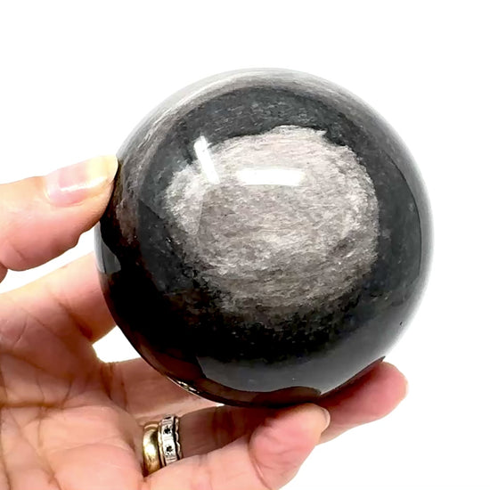 This enchanting Large Silver Sheen Obsidian Sphere measuring 7.7cm in diameter displays an intense jet-black Black Obsidian base that lights up with a shimmering, silver sheen reminiscent of moonlight.