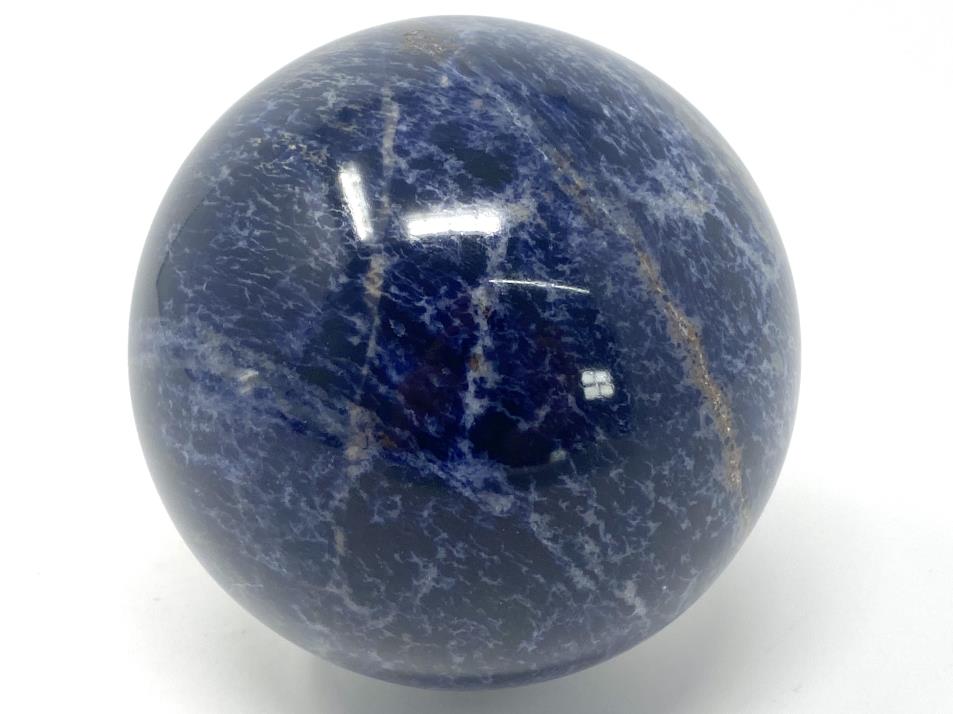 This gorgeous Large Sodalite Crystal Sphere measuring a magnificent 9.2cm in diameter displays a deep royal-blue hue contrasted against streaks of White Calcite, with orange-brown Hematite inclusions.