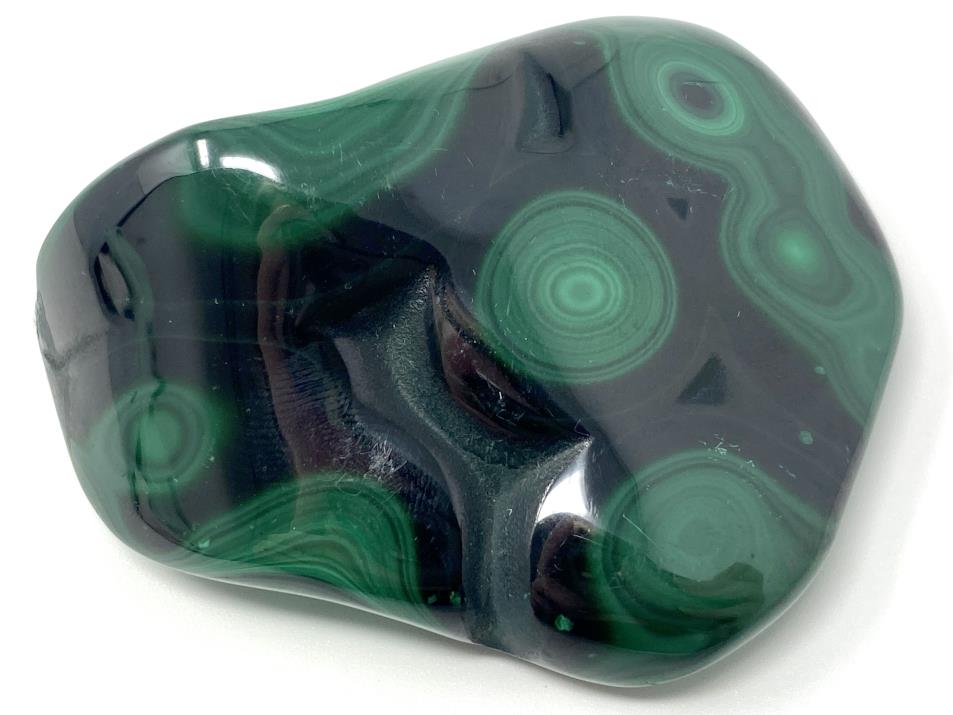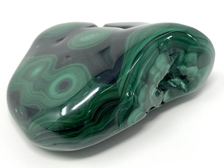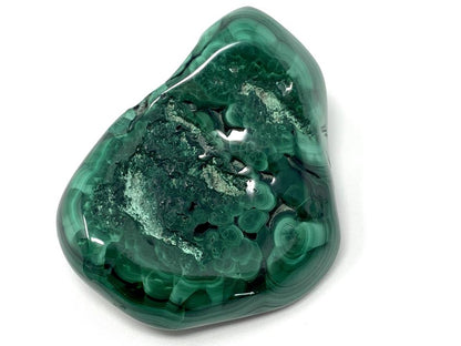 This gorgeous, high-quality Polished Malachite Crystal Freeform (also known as a Malachite Crystal Free Shape) measures 6.7cm long and displays a gorgeous leafy green hue topped with stunning swirls, orbs, and eye-like patterns.
