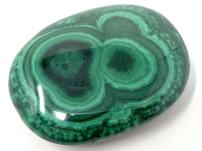 This gorgeous, high-quality Malachite Crystal Pebble (also known as a Malachite Crystal Palm Stone) measures 5.7cm long and displays a gorgeous leafy green hue topped with stunning swirls, orbs, and eye-like patterns.