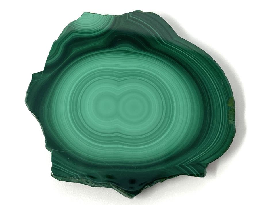 This gorgeous, high-quality Polished Malachite Crystal Slice measures 5.3cm long and displays a gorgeous leafy green hue topped with stunning swirls, orbs, and eye-like patterns.