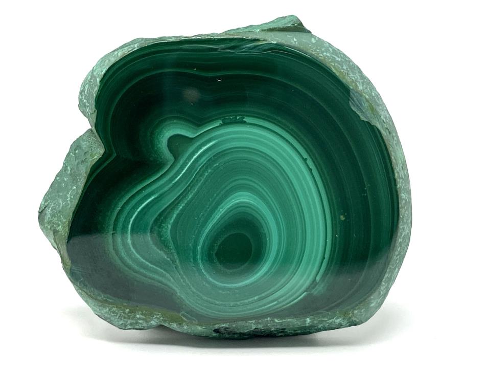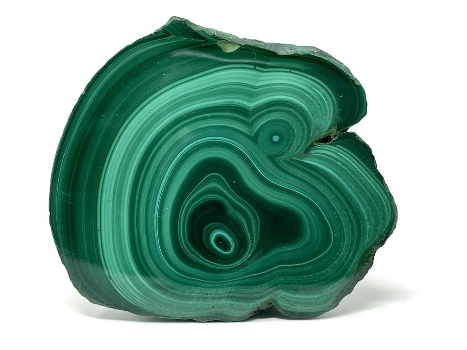 This gorgeous, high-quality Polished Malachite Crystal Slice measures 5.3cm long and displays a gorgeous leafy green hue topped with stunning swirls, orbs, and eye-like patterns.