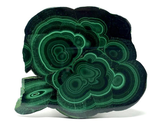 The Natural Malachite Crystal has been carefully cut into a thin crystal slice shape with two polished faces and rough natural crystal edges.