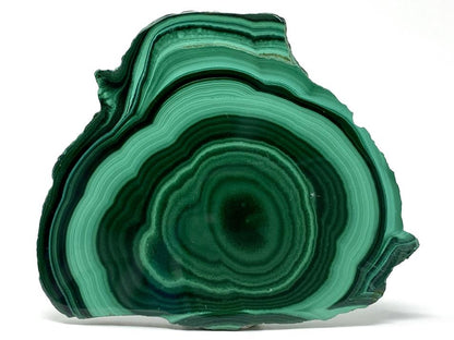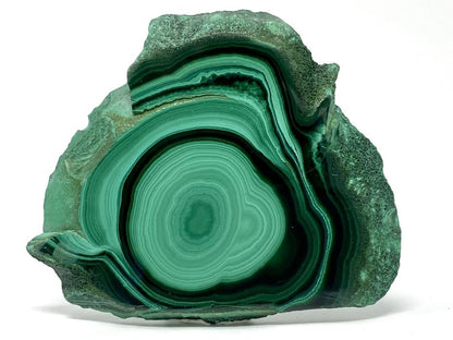 This gorgeous, high-quality Polished Malachite Crystal Slice measures 8.8cm long and displays a gorgeous leafy green hue topped with stunning swirls, orbs, and eye-like patterns.