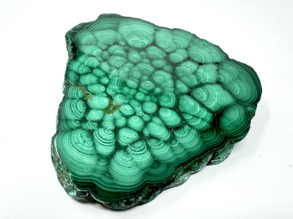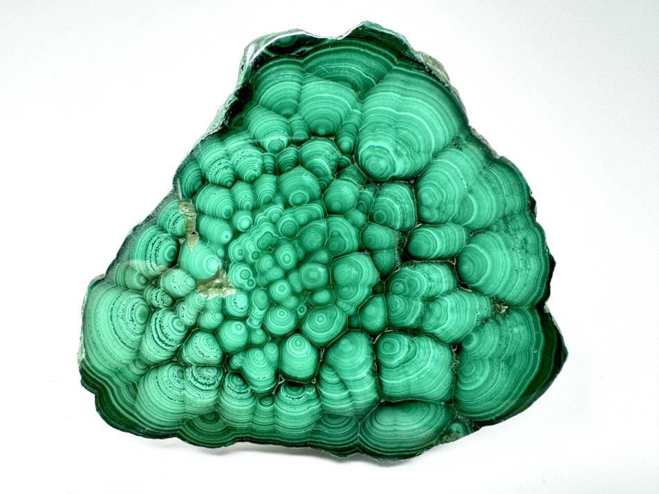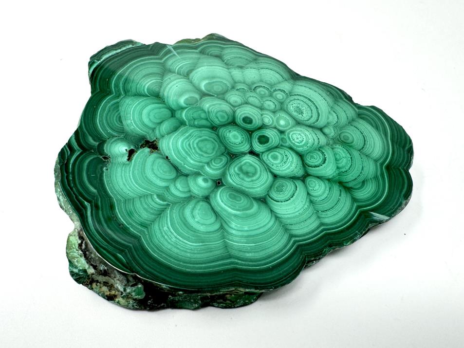 This gorgeous, high-quality Polished Malachite Crystal Slice measures 7cm long and displays a gorgeous leafy green hue topped with stunning swirls, orbs, and eye-like patterns.