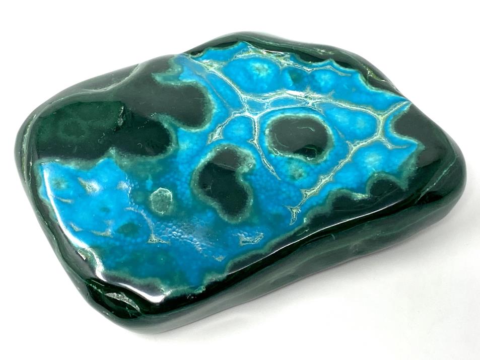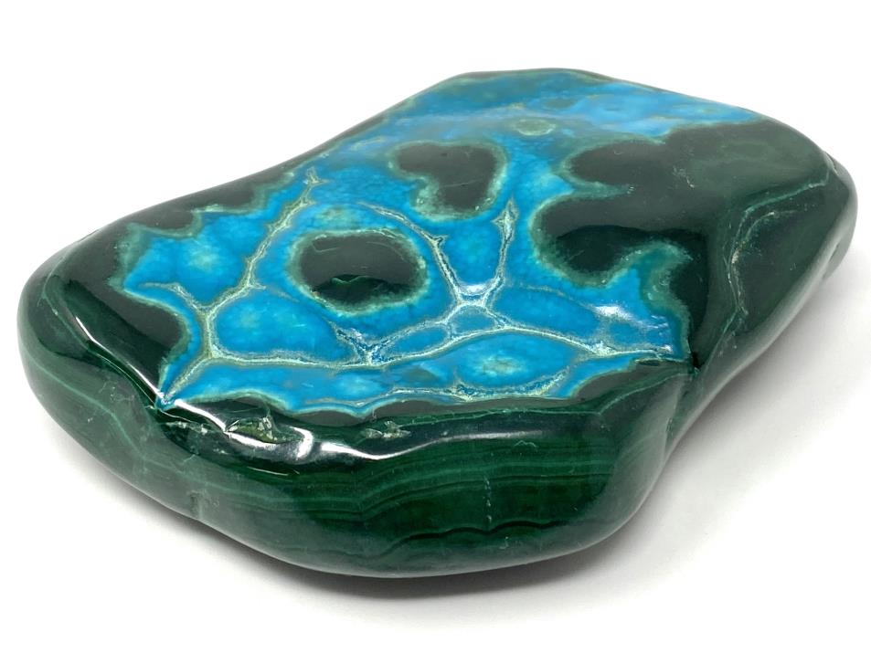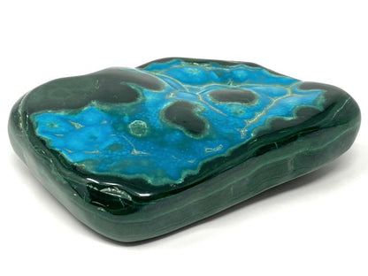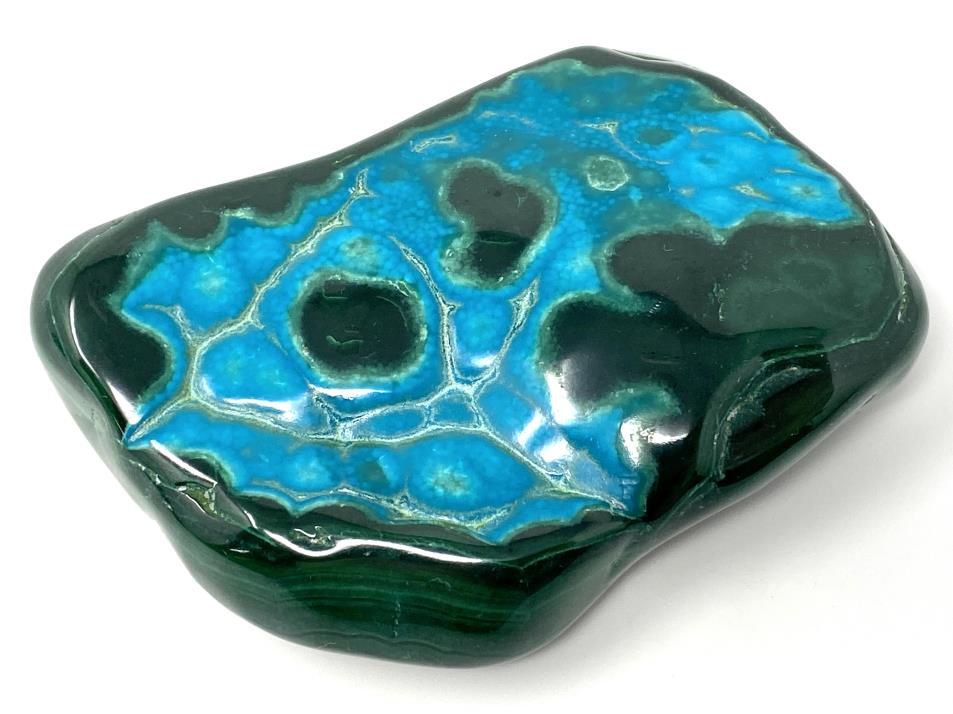 This striking, hand-polished Malacholla Crystal Freeform measures 8.5cm long and displays gorgeous turquoise and aqua-blue hues alongside deep emerald greens, given its harmonious mixture of Blue Chrysocolla and Green Malachite.
