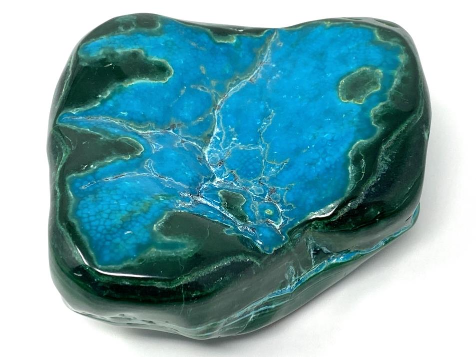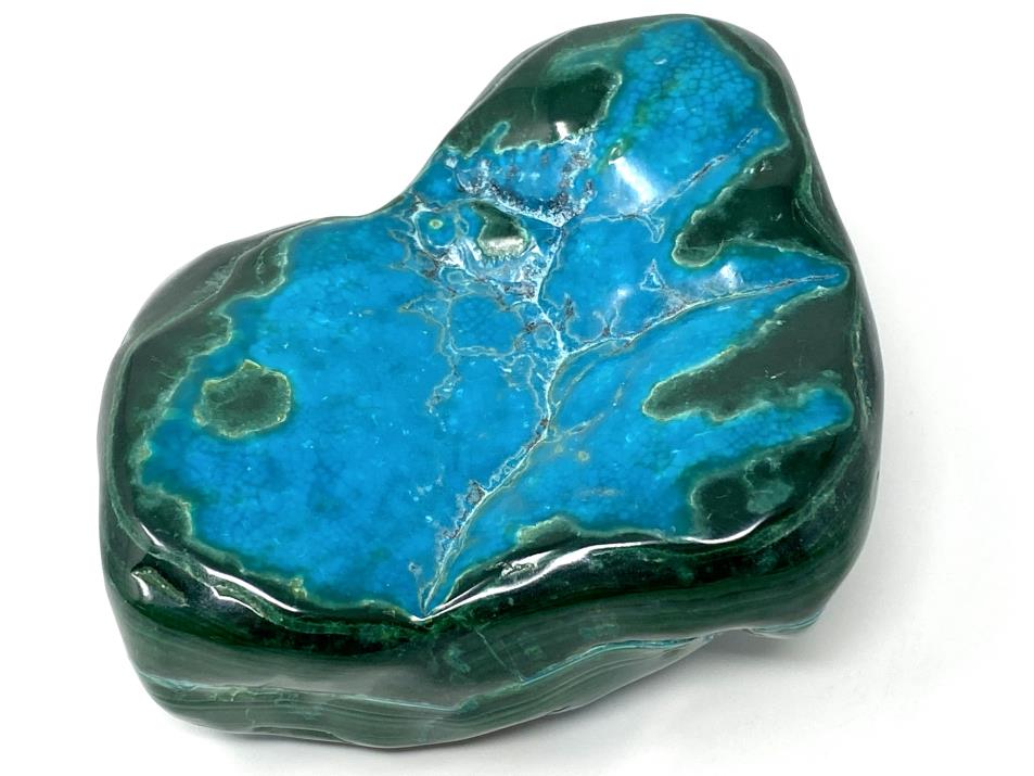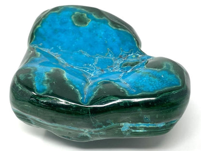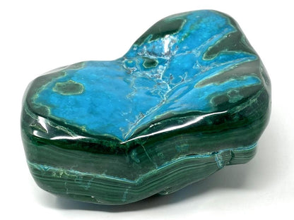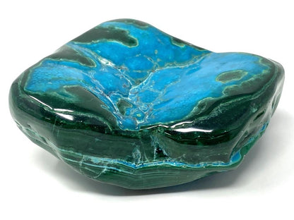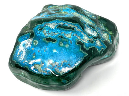 This striking, hand-polished Large Malacholla Crystal Freeform measures 10.2cm long and displays gorgeous turquoise and aqua-blue hues alongside deep emerald greens, given its harmonious mixture of Blue Chrysocolla and Green Malachite.