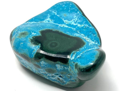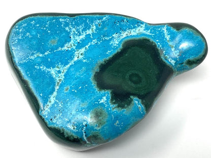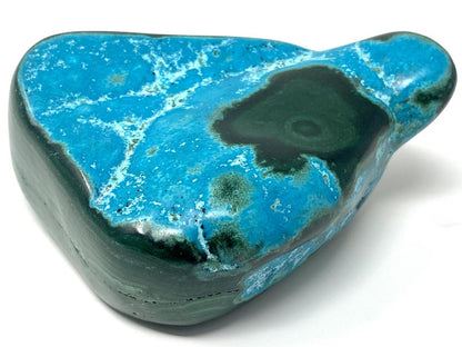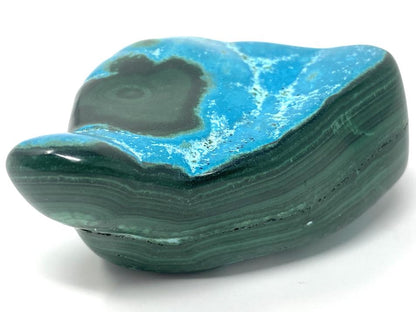 This striking, hand-polished Malacholla Crystal Freeform measures 9cm long and displays gorgeous turquoise and aqua-blue hues alongside deep emerald greens, given its harmonious mixture of Blue Chrysocolla and Green Malachite.