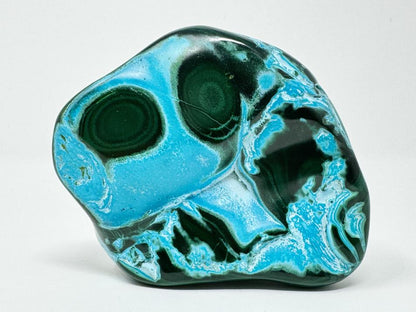 This Malachite and Chrysocolla crystal displays stunning swirls, orbs, and eye-like patterns.