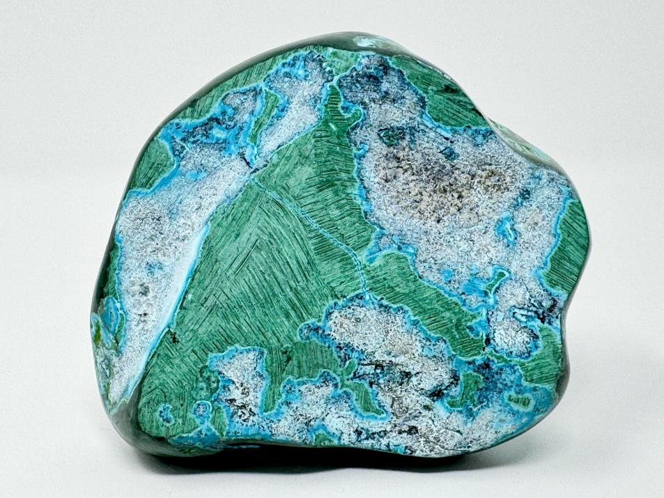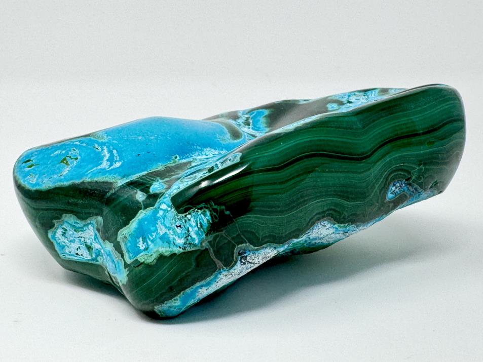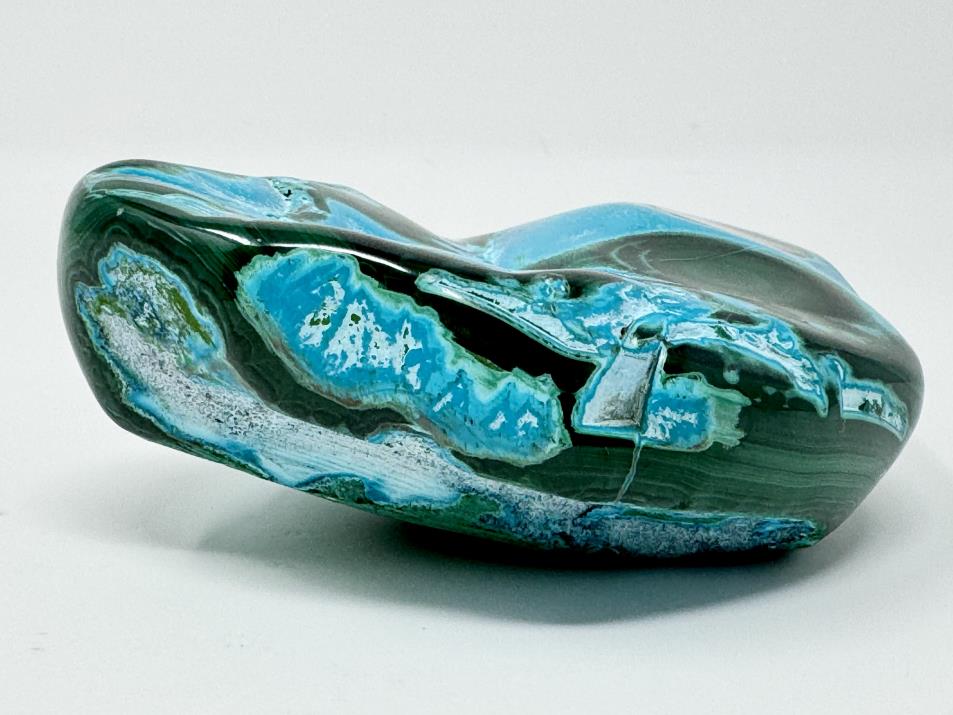 This striking, hand-polished Large Malacholla Crystal Freeform measures 10.5cm long and displays gorgeous turquoise and aqua-blue hues alongside deep emerald greens, given its harmonious mixture of Blue Chrysocolla and Green Malachite.