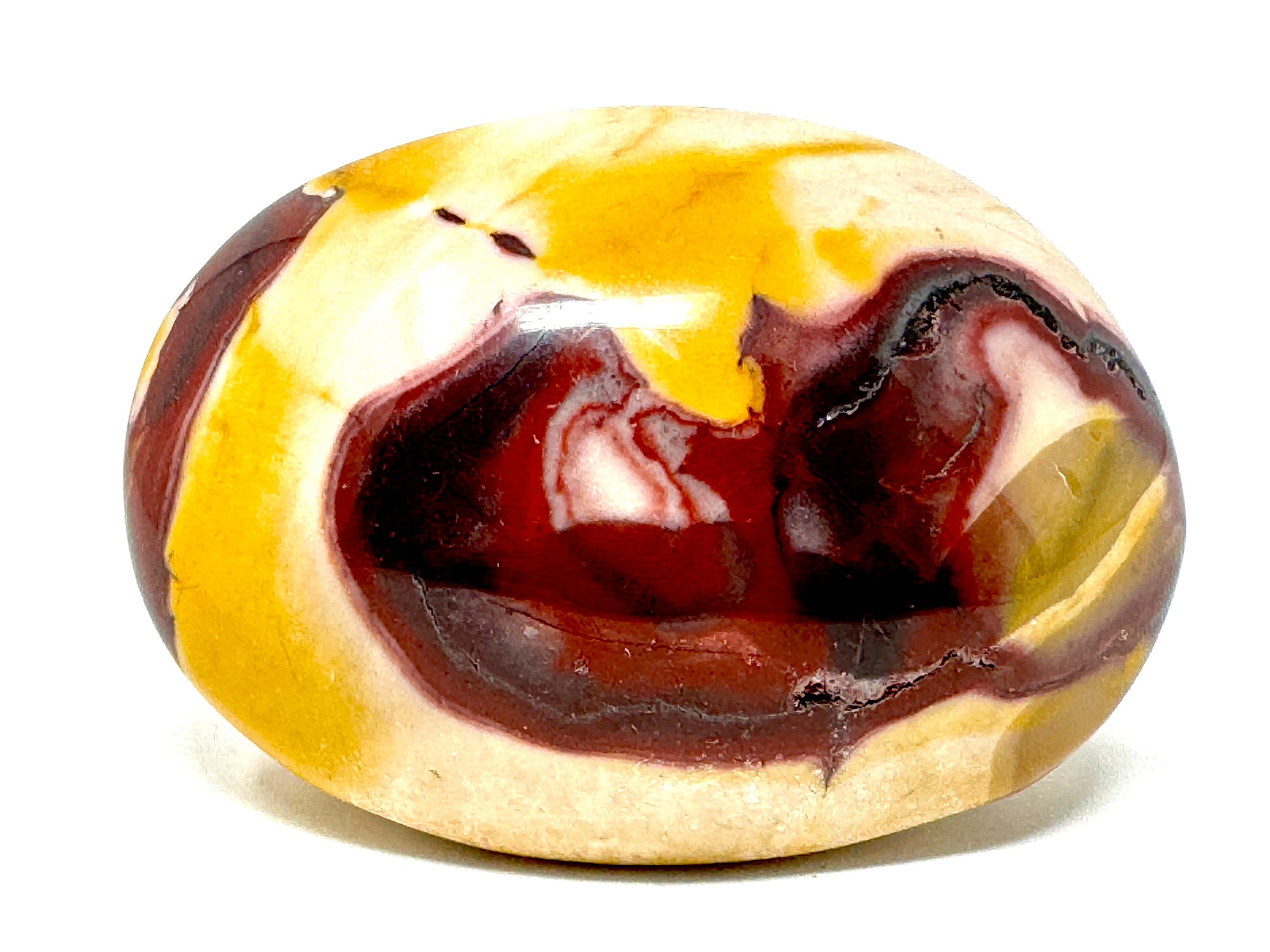 Mookaite is incredibly vibrant in colour, and displays a range of vivid scarlets, brick reds, mustard yellows, and deep maroons in swirling patterns.