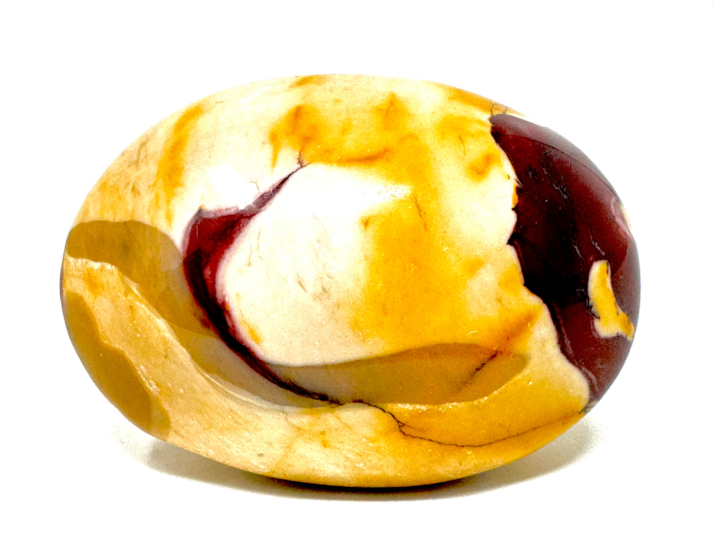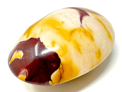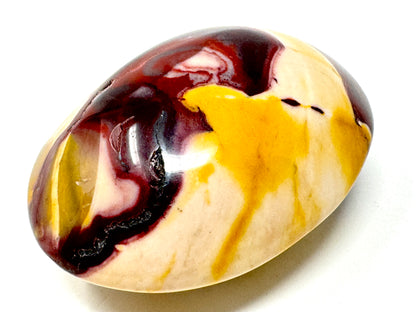 This gorgeous Mookaite Pebble (Mookaite Palm Stone) measuring 5.7cm long has been carefully hand-polished to enhance its vibrant kaleidoscope of colour, which includes vibrant reds, mustard-yellows, maroons, and cream, white, and beige tones.