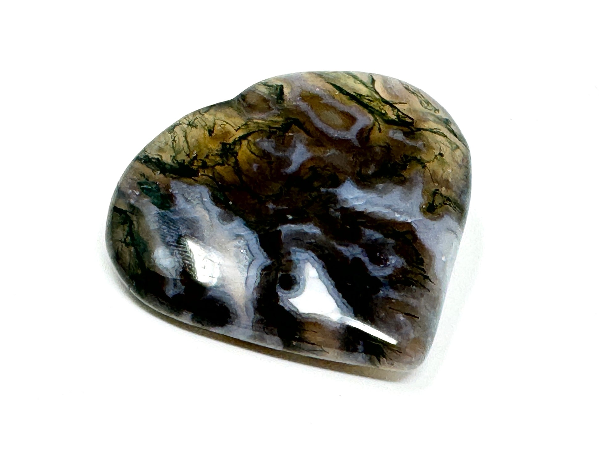 This Moss Agate Heart showcases stunning milky White Quartz/ White Agate adorned with dark and verdant green tree-like, moss-like dendritic patterns.