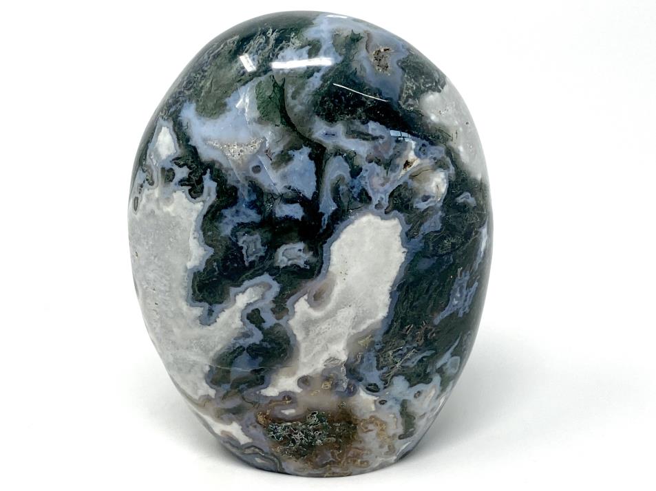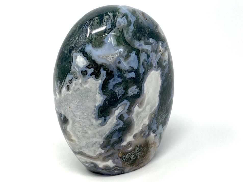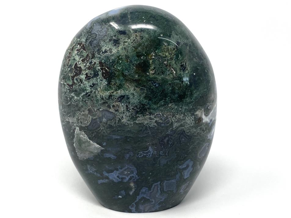 This Moss Agate Free Shape showcases stunning milky White Quartz/ White Agate and gorgeous translucent Blue-Grey Agate/ Blue-Grey Chalcedony adorned with dark and verdant green tree-like, moss-like dendritic patterns.