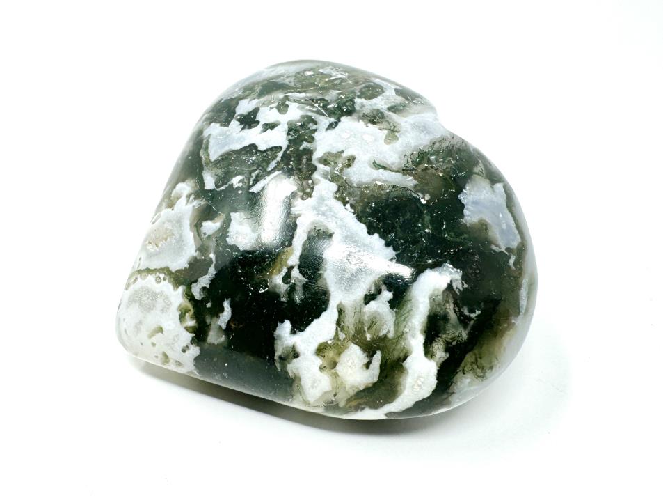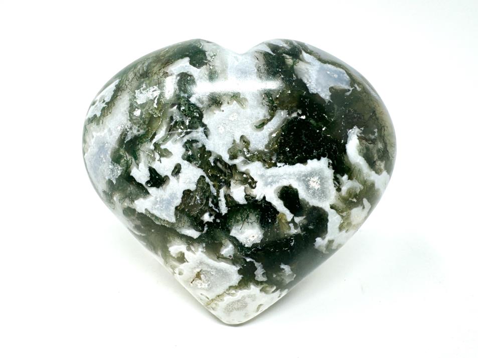 This gorgeous Moss Agate Crystal Heart (also known as a Tree Agate Crystal Heart) measuring 5.7cm wide has been carefully cut and polished into a crystal heart shape from Green Moss Agate Stone.