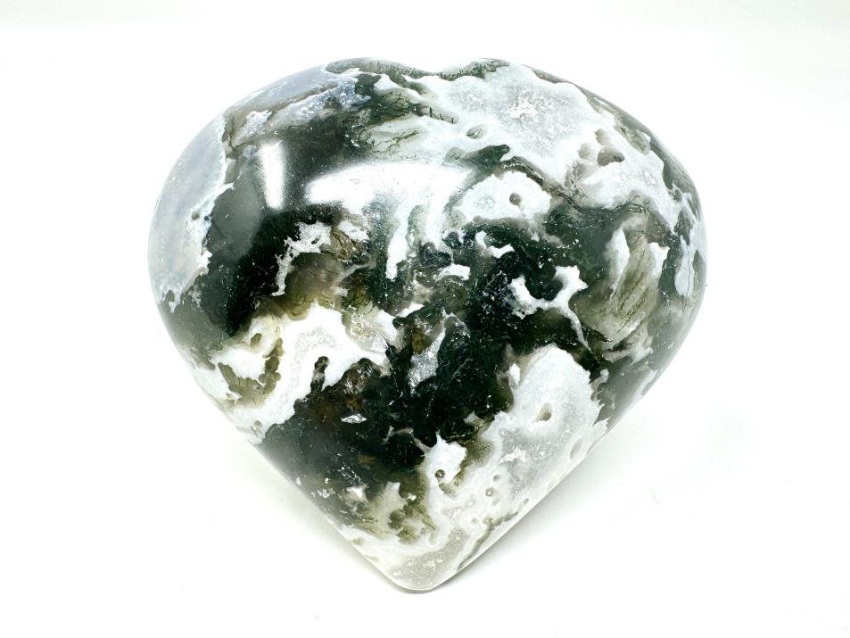 This Moss Agate Heart showcases stunning milky White Quartz/ White Agate adorned with dark and verdant green tree-like, moss-like dendritic patterns.