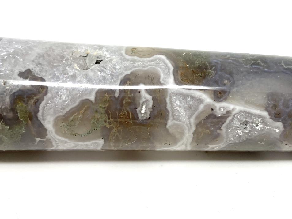 This Moss Agate Massage Wand showcases stunning milky White Quartz/ White Agate and gorgeous translucent Blue-Grey Agate/ Blue-Grey Chalcedony adorned with dark and verdant green tree-like, moss-like dendritic patterns.