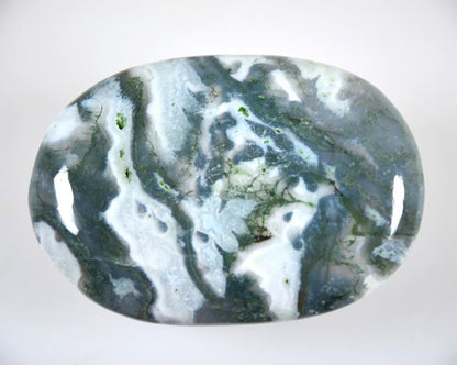 This gorgeous Moss Agate Crystal Pebble (also known as a Tree Agate Crystal Pebble) measuring 6.6cm long has been carefully cut and polished into a tactile oval palm stone shape from Green Moss Agate Stone.