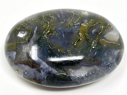 This gorgeous Moss Agate Crystal Pebble (also known as a Tree Agate Crystal Pebble) measuring 6.5cm long has been carefully cut and polished into a tactile oval palm stone shape from Green Moss Agate Stone.