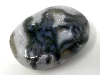 This gorgeous Moss Agate Crystal Pebble (also known as a Tree Agate Crystal Pebble) measuring 6.4cm long has been carefully cut and polished into a tactile oval palm stone shape from Green Moss Agate Stone.