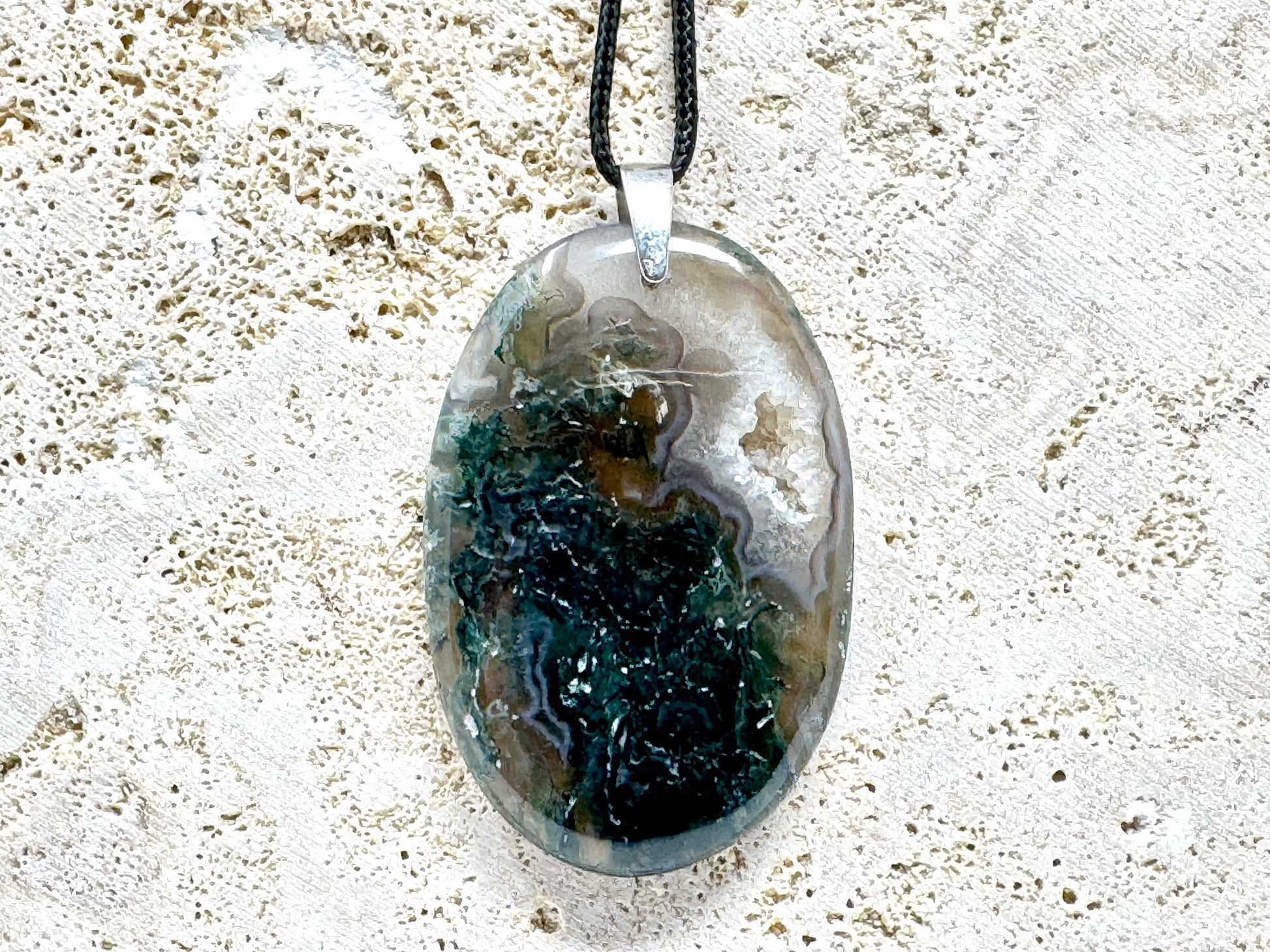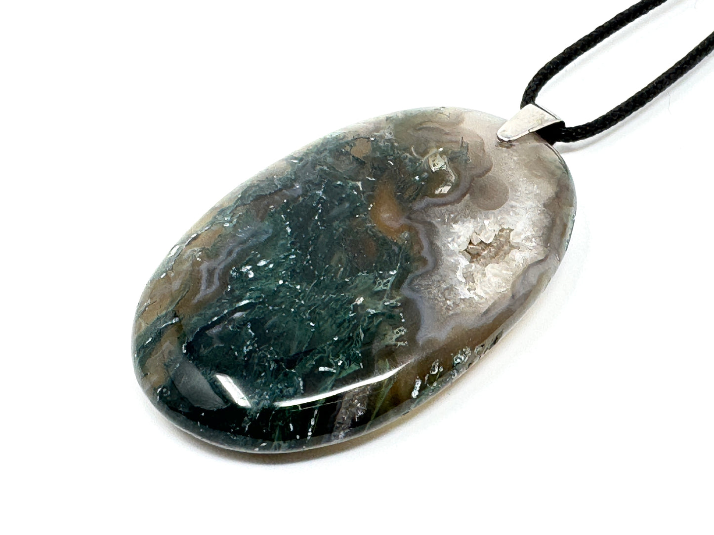 This gorgeous Large Moss Agate Pendant (Large Tree Agate Pendant) is ideal for the crystal collector or crystal healer, and makes a wonderful crystal gift for loved ones: each Moss Agate Crystal (Tree Agate Crystal) is truly unique due to their individual mineral inclusions and patterns.