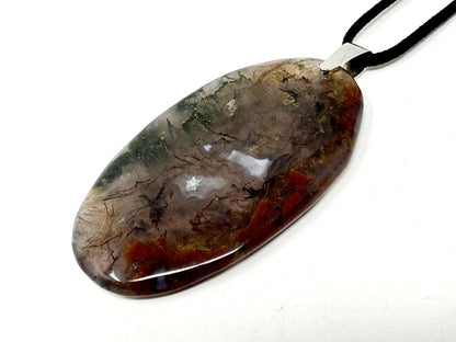 This beautiful, high-quality, hand-made Moss Agate Pendant (also known as a Tree Agate Pendant) measuring 5.8cm long displays stunning milky White Quartz/ White Agate and gorgeous translucent Blue-Grey Agate/ Blue-Grey Chalcedony adorned with dark and verdant green tree-like, moss-like dendritic patterns, and unusual autumnal red hues.