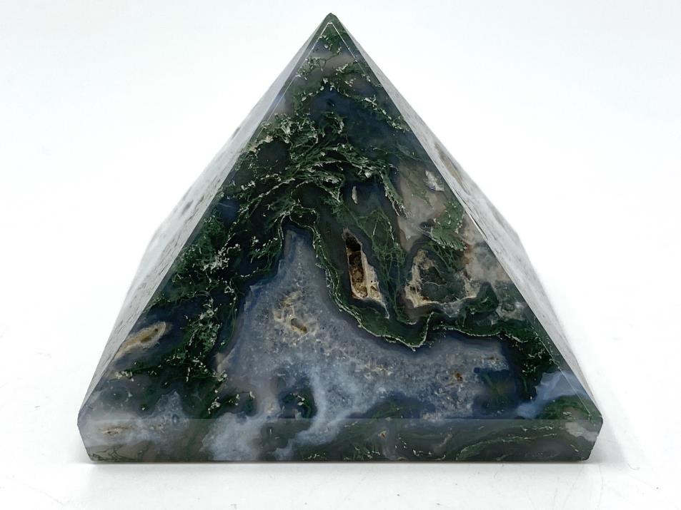This gorgeous Moss Agate Crystal Pyramid (also known as a Tree Agate Crystal Pyramid) displaying a 5.5cm wide square base has been carefully cut and polished into a crystal pyramid shape, with a sharp pointed tip, from Green Moss Agate Stone.