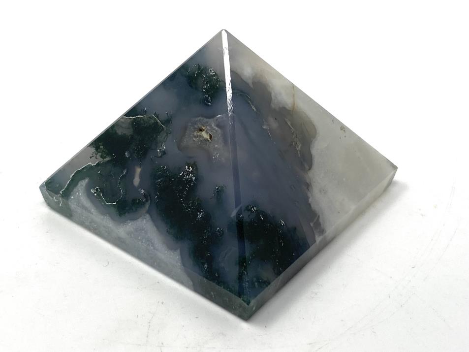 This gorgeous Moss Agate Crystal Pyramid (also known as a Tree Agate Crystal Pyramid) displaying a 4.4cm wide square base has been carefully cut and polished into a crystal pyramid shape, with a sharp pointed tip, from Green Moss Agate Stone.