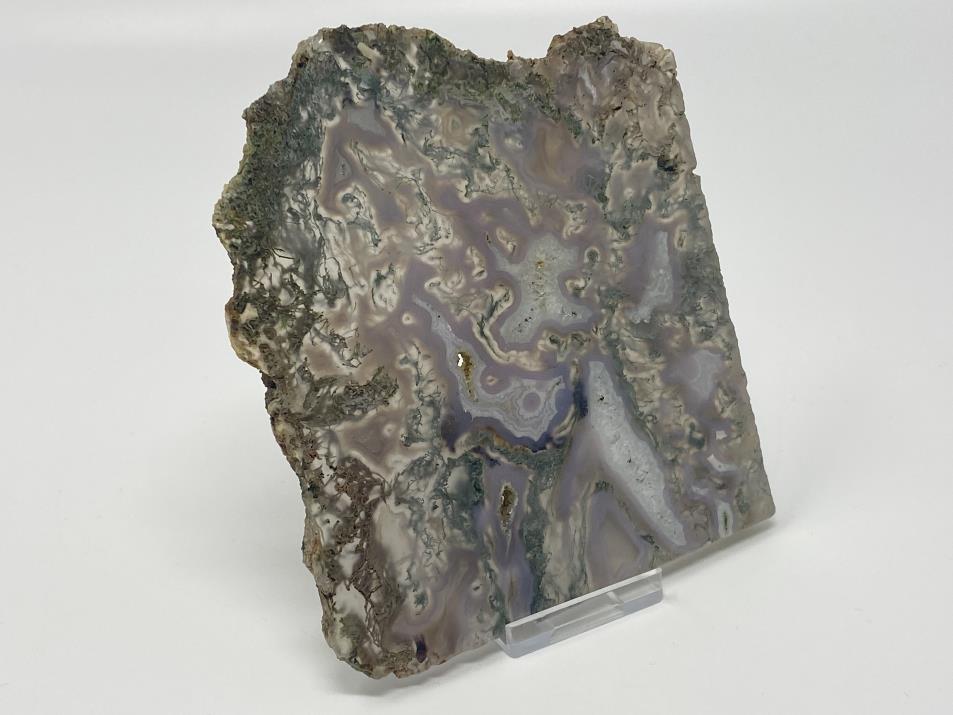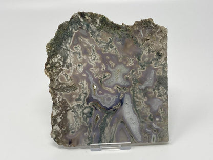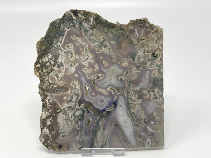 This Moss Agate Slice showcases stunning milky White Quartz/ White Agate and gorgeous translucent Blue-Grey Agate/ Blue-Grey Chalcedony adorned with dark and verdant green tree-like, moss-like dendritic patterns.