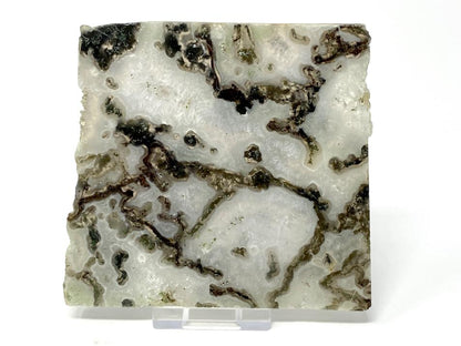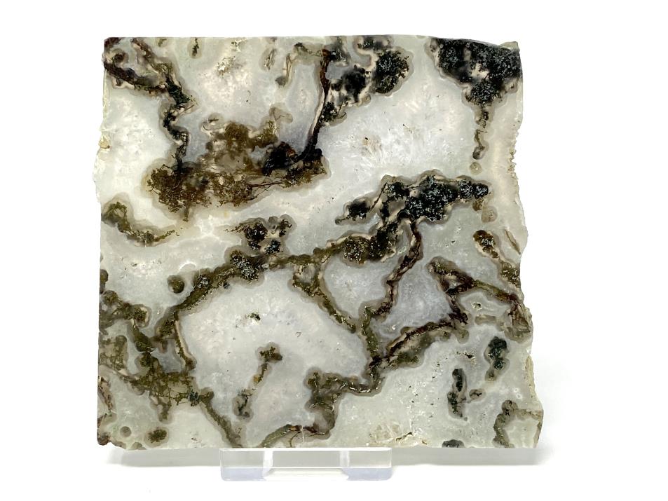 This Moss Agate Slice showcases stunning milky White Quartz/ White Agate and gorgeous translucent Grey Agate/ Chalcedony adorned with dark and verdant green tree-like, moss-like dendritic patterns.