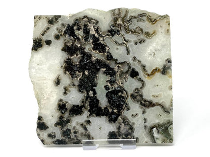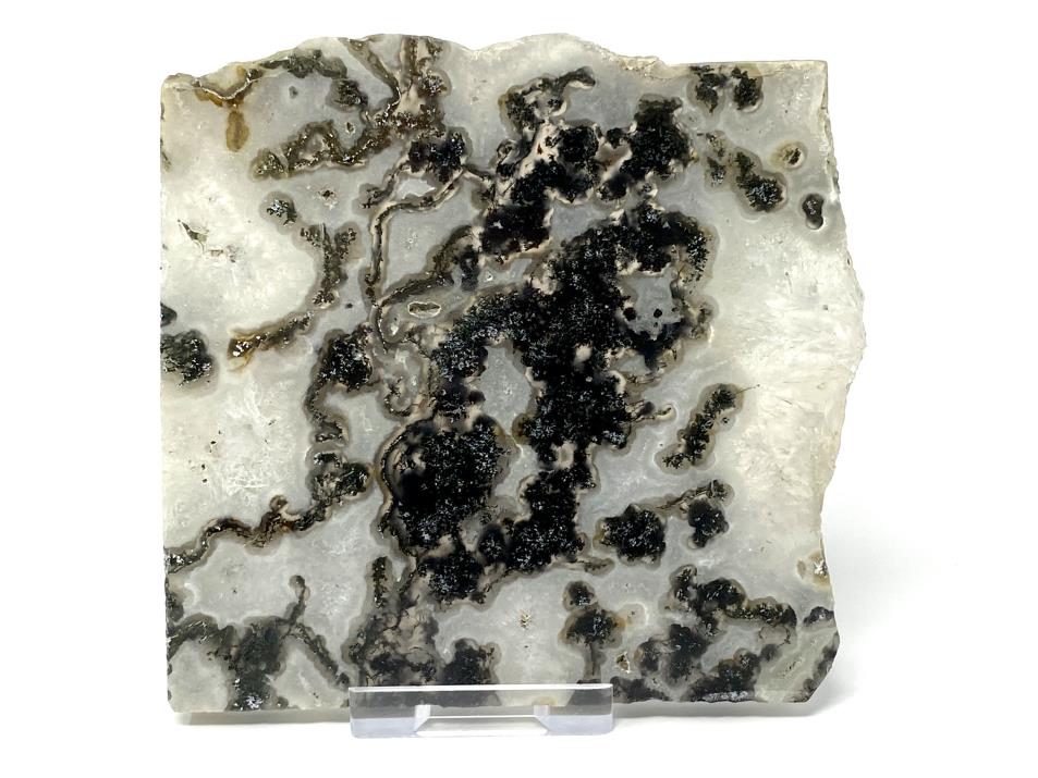 This Moss Agate Slice showcases stunning milky White Quartz/ White Agate and gorgeous translucent Grey Agate/ Chalcedony adorned with dark and verdant green tree-like, moss-like dendritic patterns.