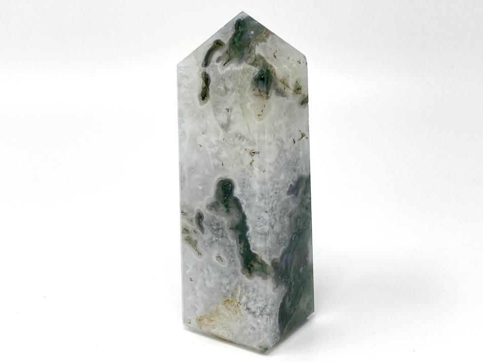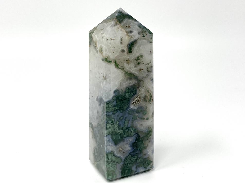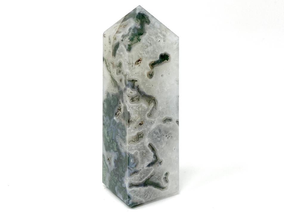 This gorgeous Moss Agate Crystal Tower (also known as a Tree Agate Crystal Tower) measuring 11cm tall has been carefully cut and polished from Green Moss Agate Stone into a crystal tower/ obelisk shape, with a free-standing square-shaped base, four polished faces, and sharp pointed tip.