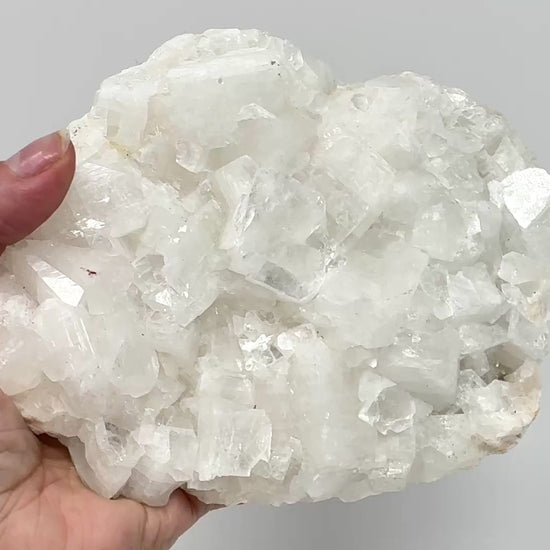 This sumptuous large Natural Apophyllite Crystal Cluster measuring 19cm long displays a stunning cluster of natural crystals which glistens and glimmers with mesmerising, sparkling Apophyllite Crystals in a range of clear and white hues.