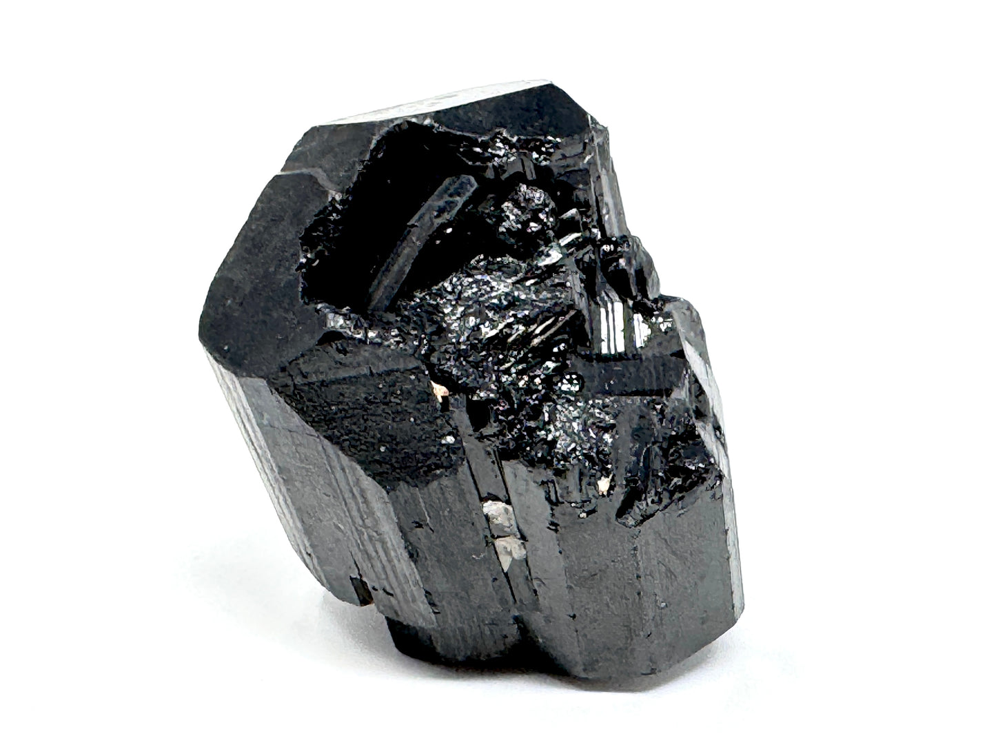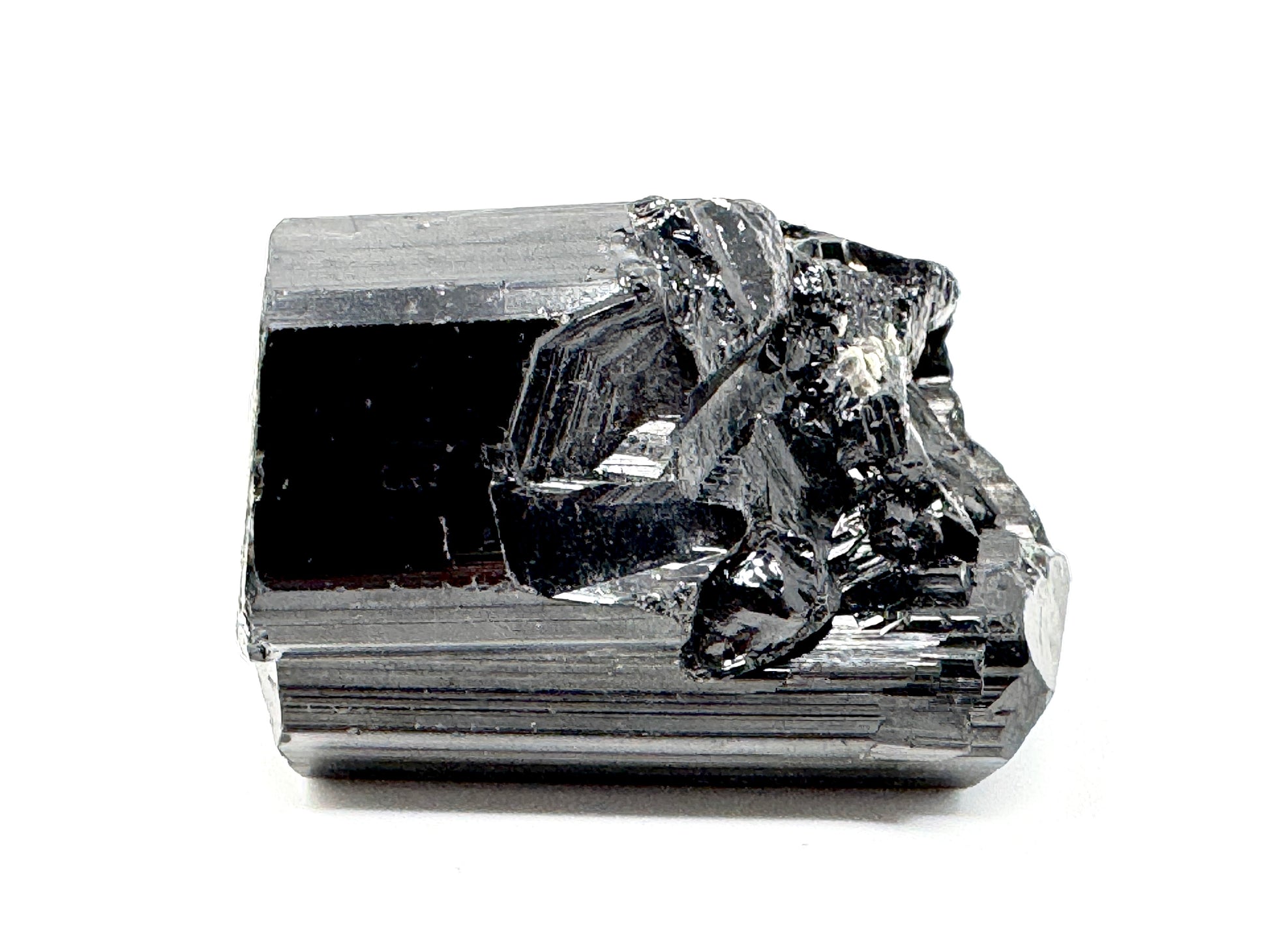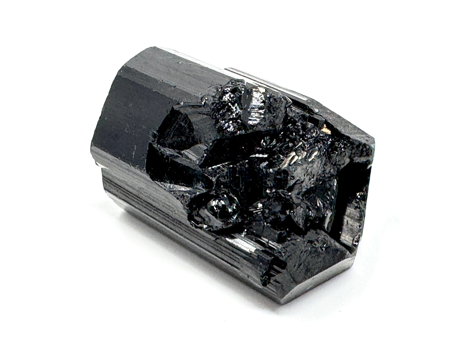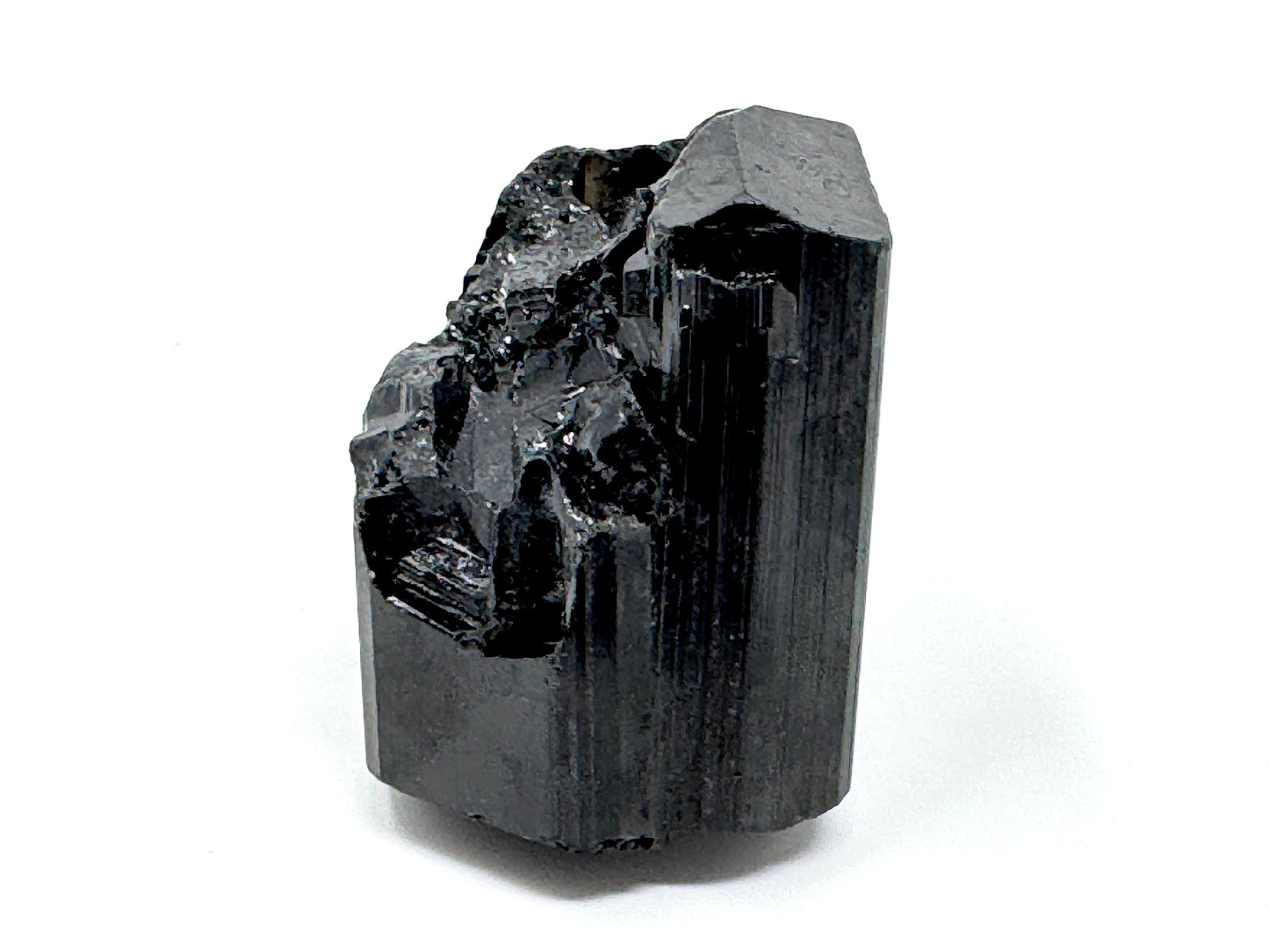 Displaying lustrous, glistening inky black tones, this Natural Black Tourmaline Crystal is smooth to the touch in some places with slightly raised ridges.