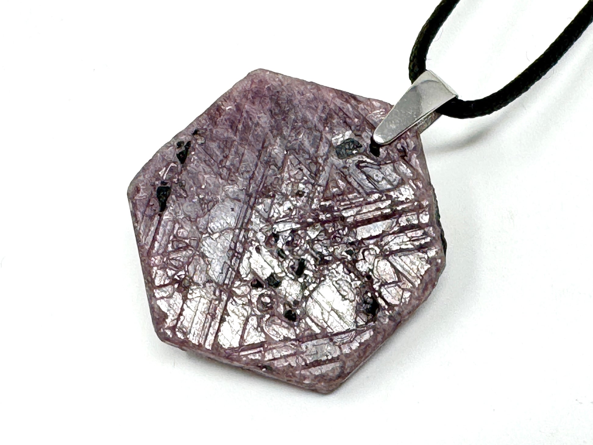 This unique Ruby Pendant made by hand from a Natural Ruby Record Keeper Crystal measures 3.8cm long and displays a fantastic natural crystal hexagon shape, deep reddish-maroon hue with sparkling flecks and glimmers, and striking triangular markings.