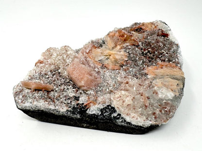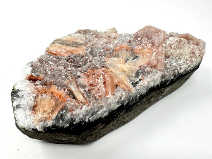 This unique Natural Zeolite Crystal displays beautiful reddish-orange and peach-orange coloured Stilbite Crystals which mesmerise with their shiny, pearly lustre, glimmering and glistening white, grey, and clear crystals, and striking grey-black rock.