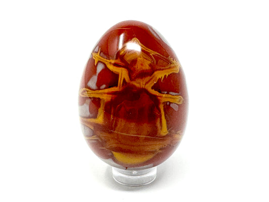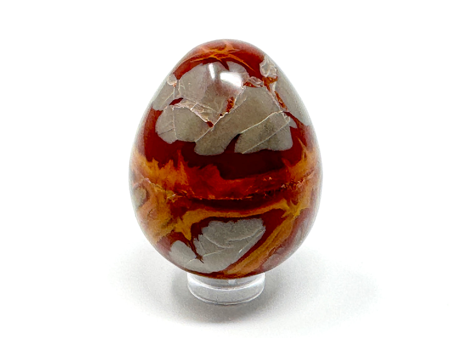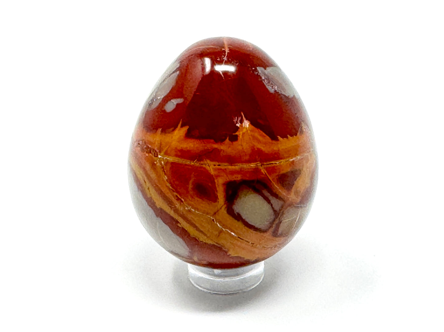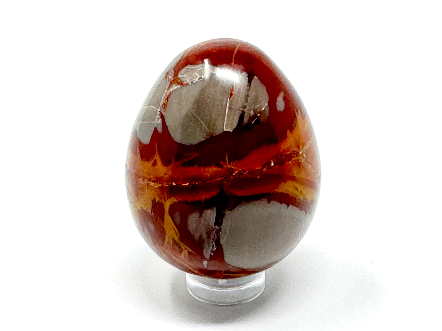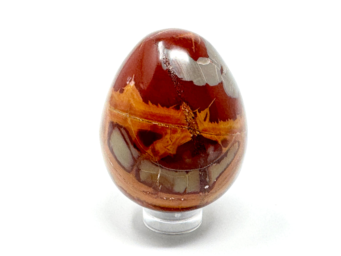 This striking Noreena Jasper Egg showcases a stunning array of rich rust-red, deep maroon, fiery orange, mustard yellow, subtle cream and stone grey hues, which complement each other beautifully.