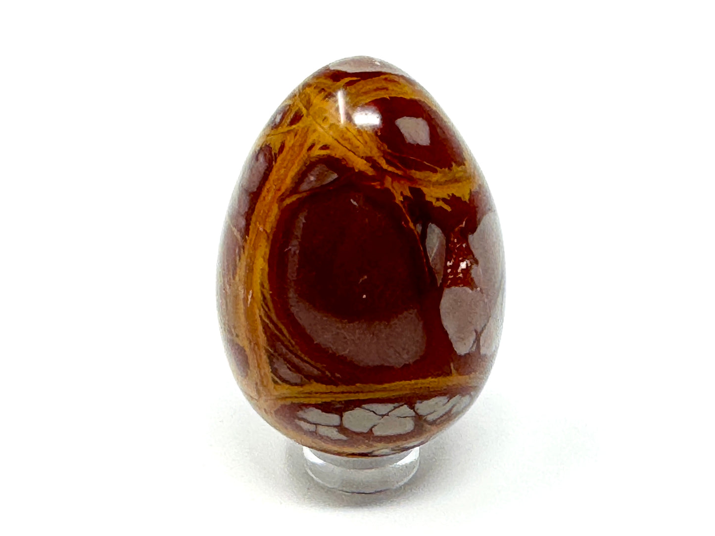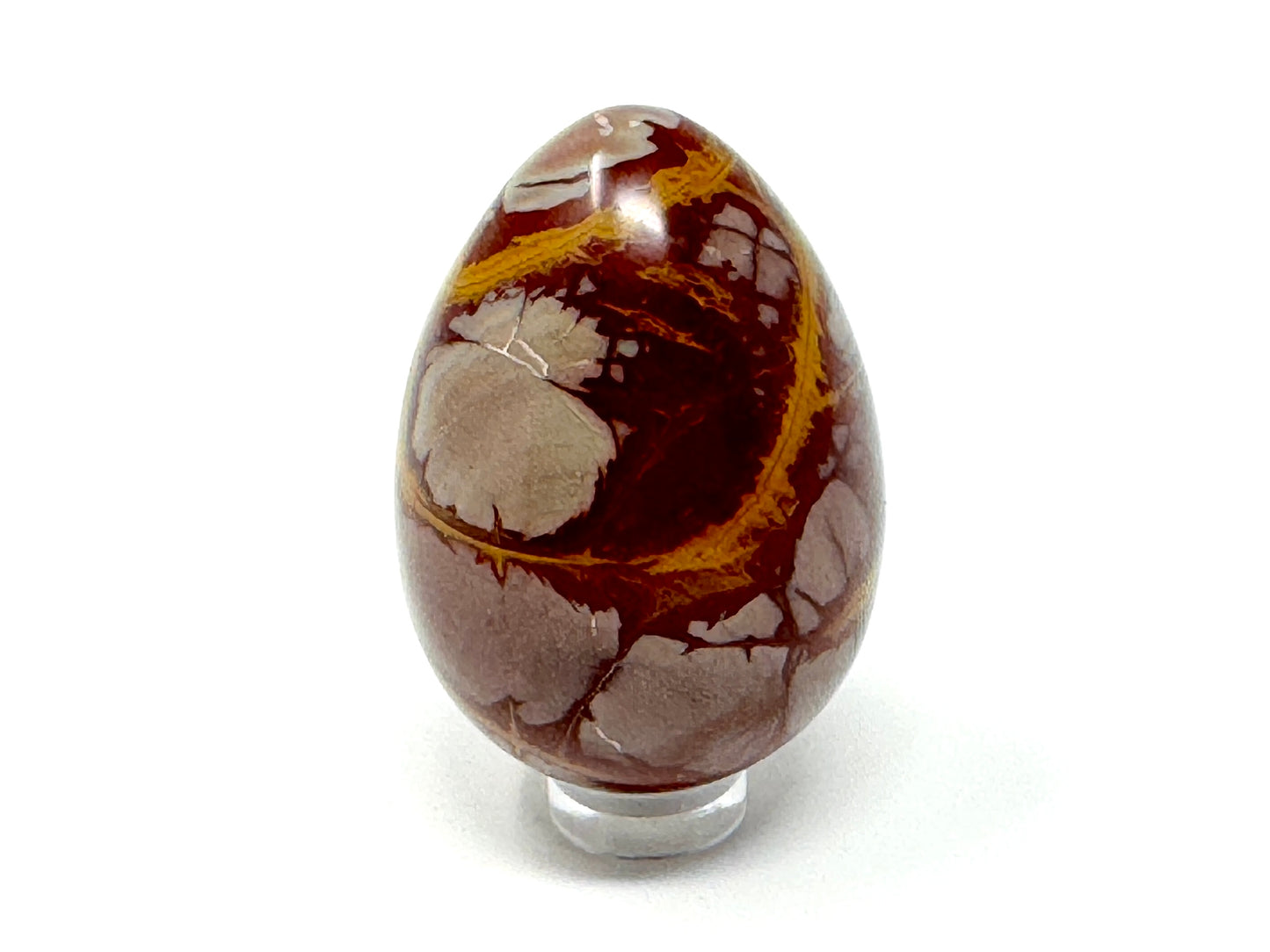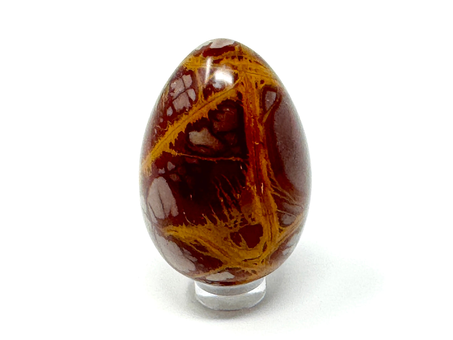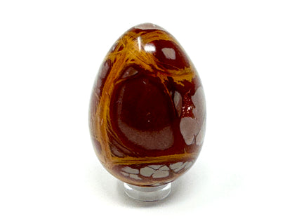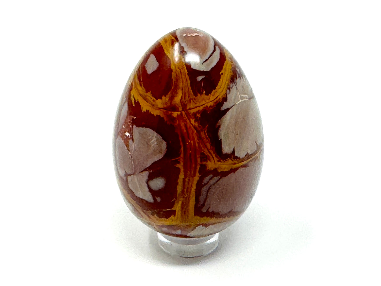 This striking Noreena Jasper Egg showcases a stunning array of rich rust-red, deep maroon, fiery orange, mustard yellow, subtle cream and stone grey hues, which complement each other beautifully.