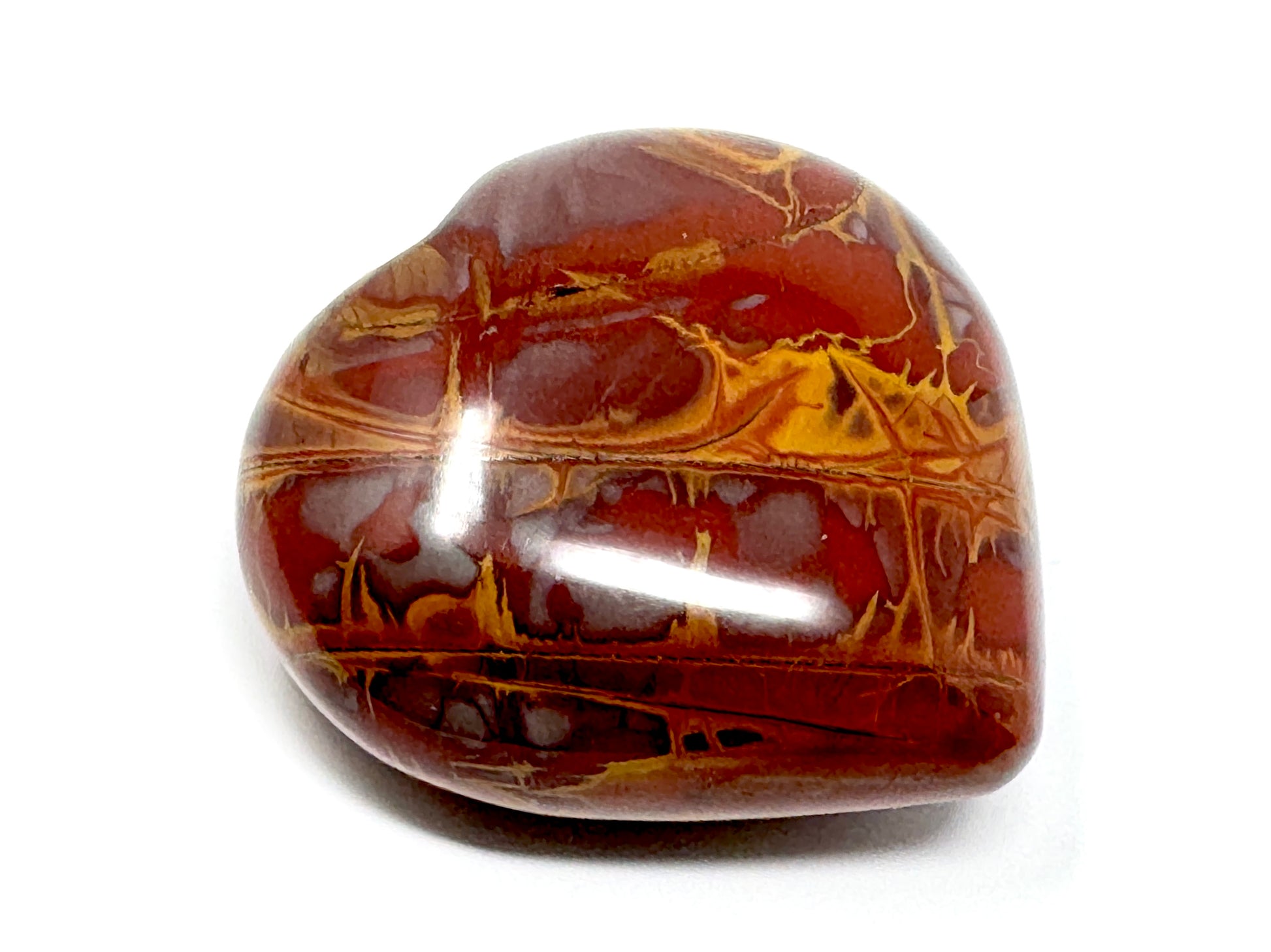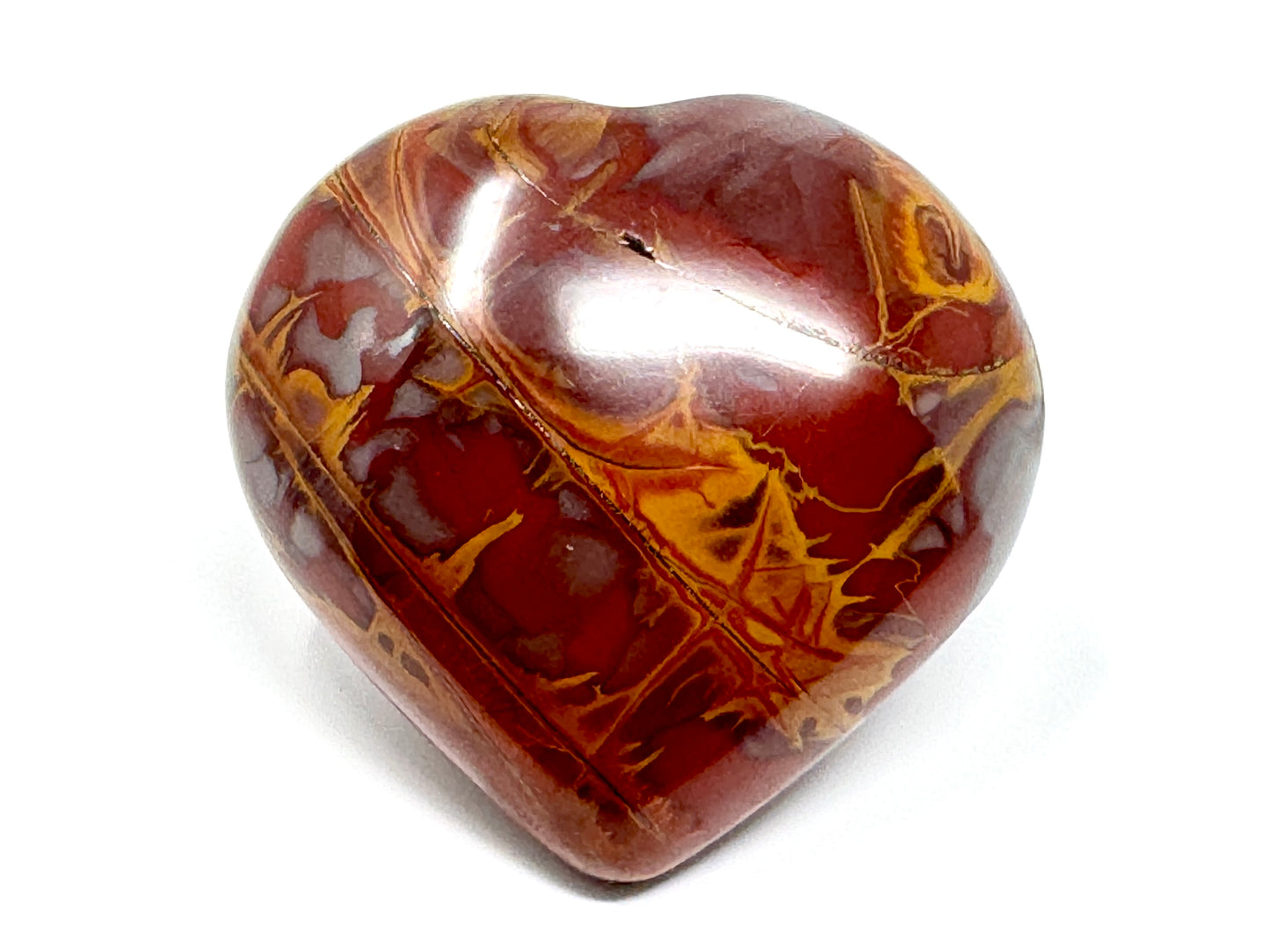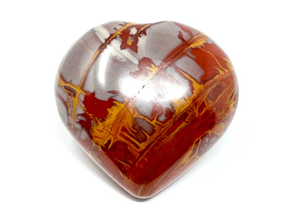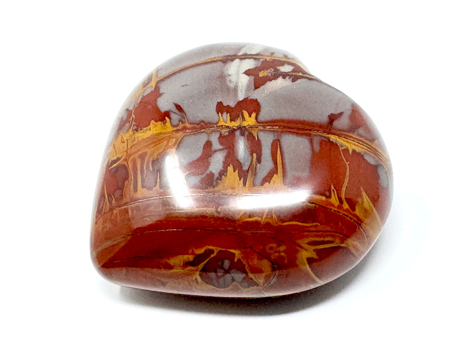 This striking Noreena Jasper Heart Crystal showcases a stunning array of rich rust-red, deep maroon, fiery orange, mustard yellow, subtle cream and stone grey hues, which complement each other beautifully.